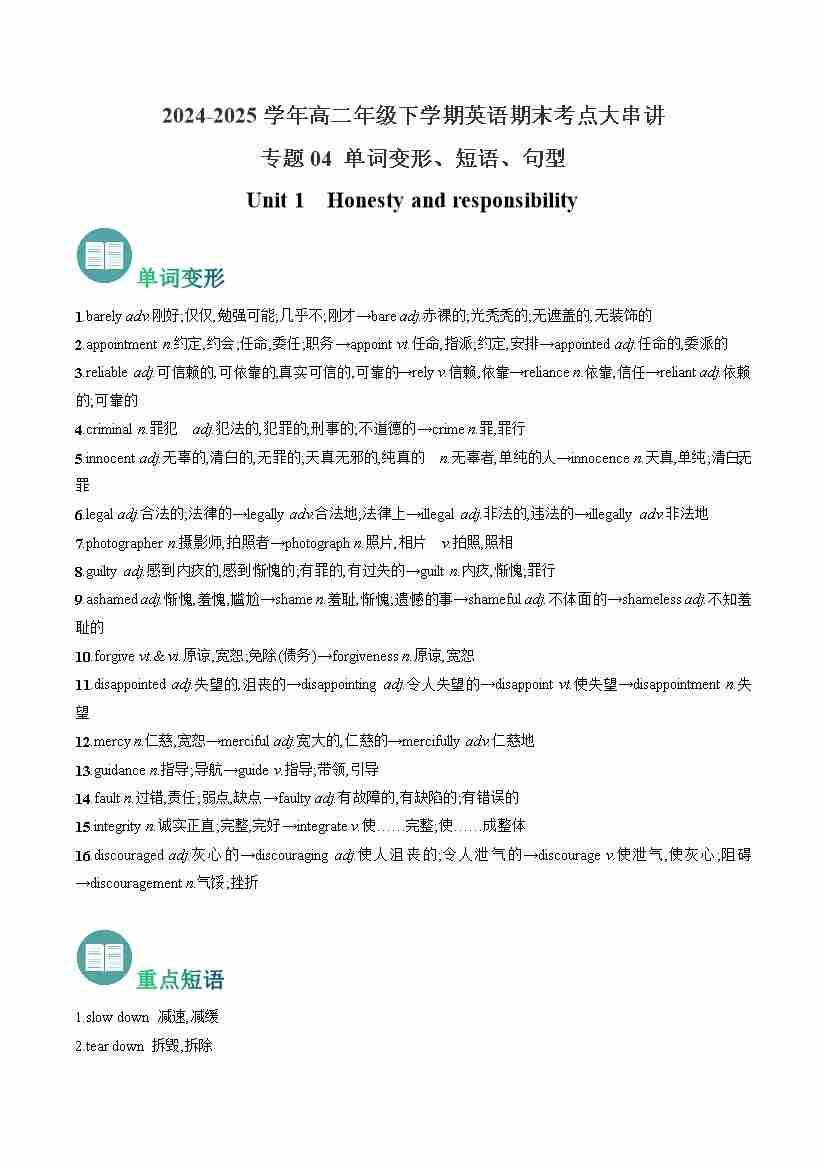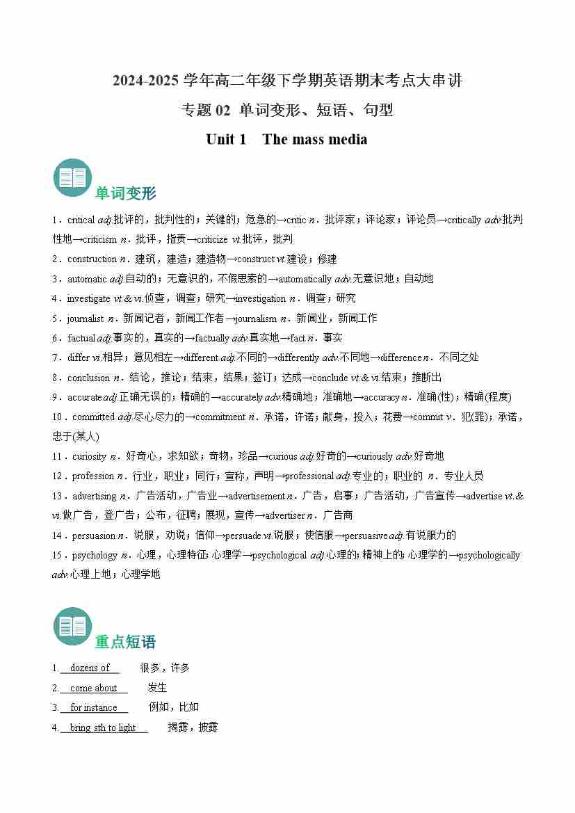 考点清单02 选择性必修二 Unit 1~Unit 4 (重点单词变形、短语、用法、句型)-(译林版2020)