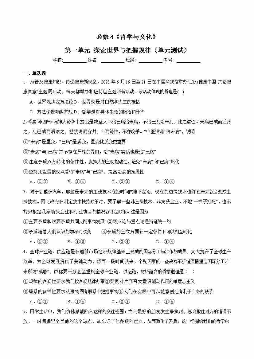 第一单元 探索世界与把握规律(单元测试·基础卷)(考试版A4)