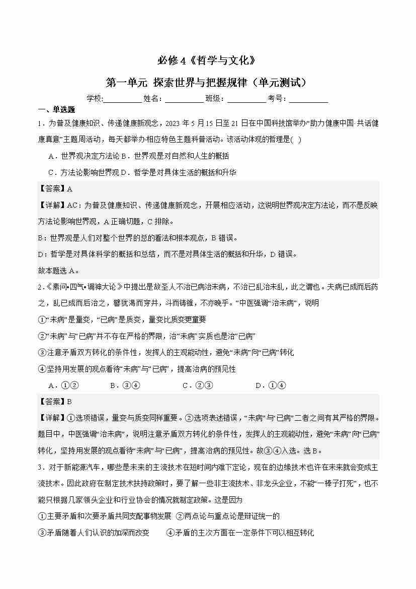 第一单元 探索世界与把握规律(单元测试)解析版-(统编版必修4)