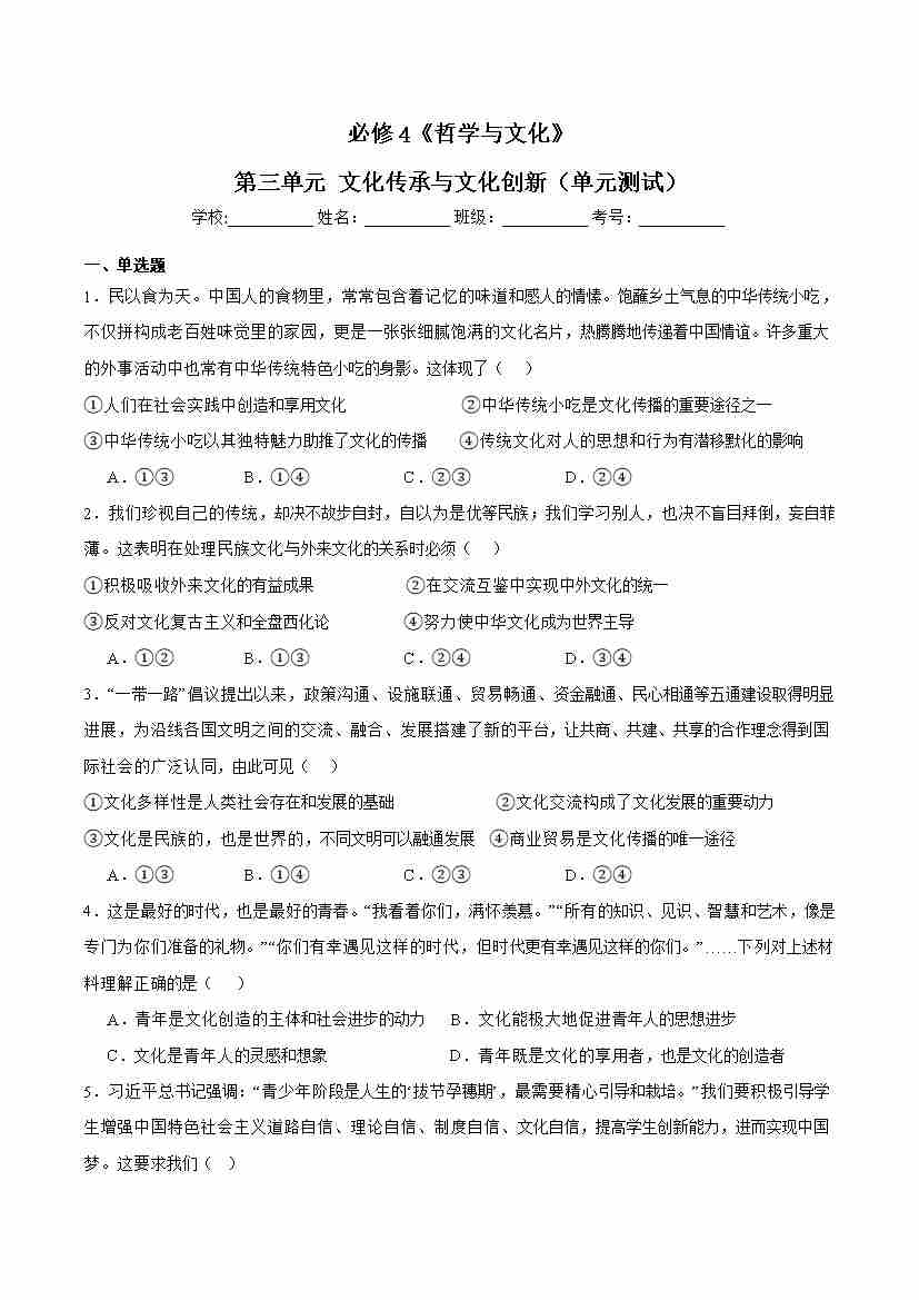 第三单元 文化传承与文化创新(单元测试)原卷版-(统编版必修4)