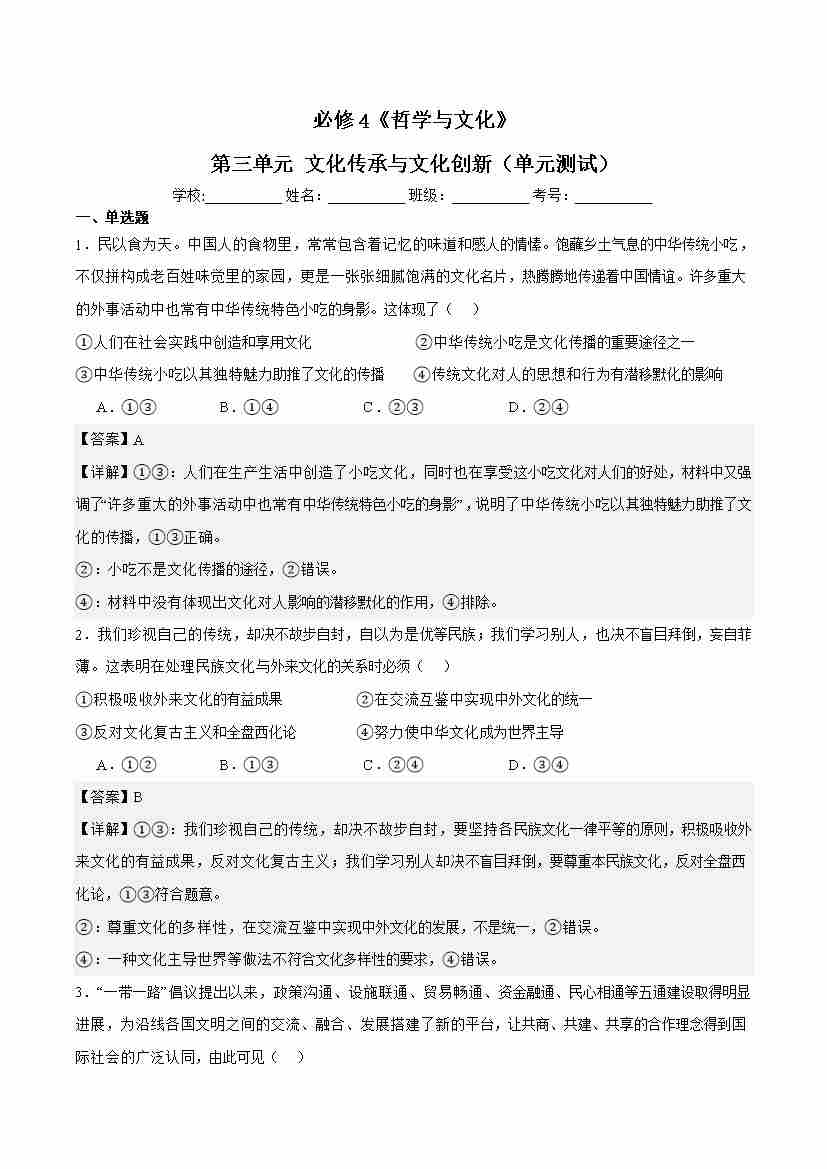 第三单元 文化传承与文化创新(单元测试)解析版-(统编版必修4)