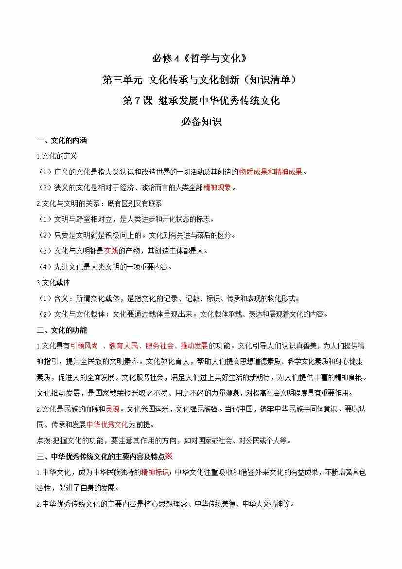 第三单元 文化传承与文化创新(知识清单)-(统编版必修4)