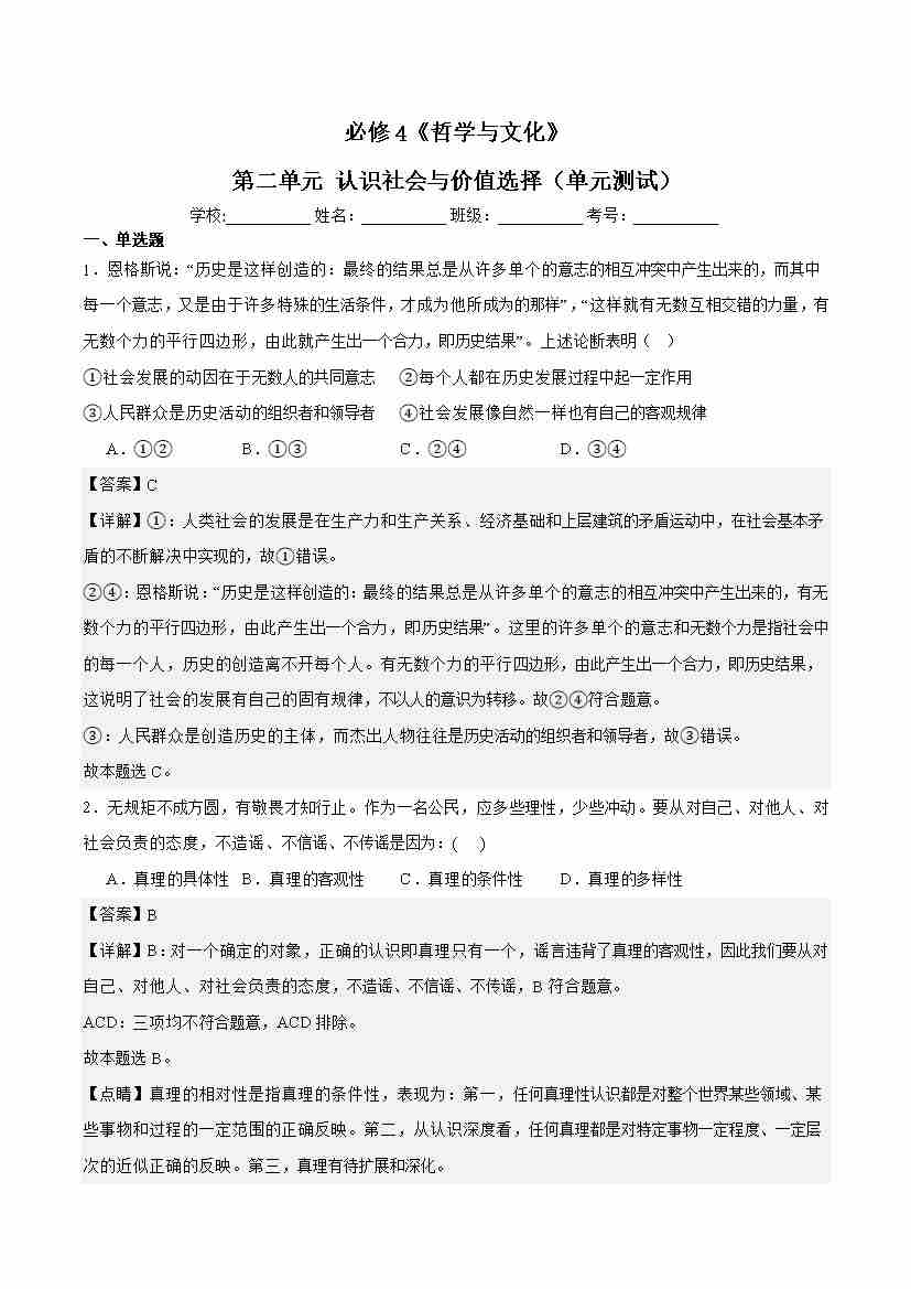第二单元 认识社会与价值选择(单元测试)解析版-(统编版必修4)