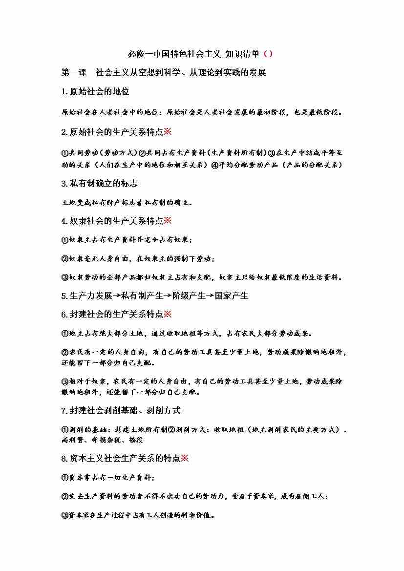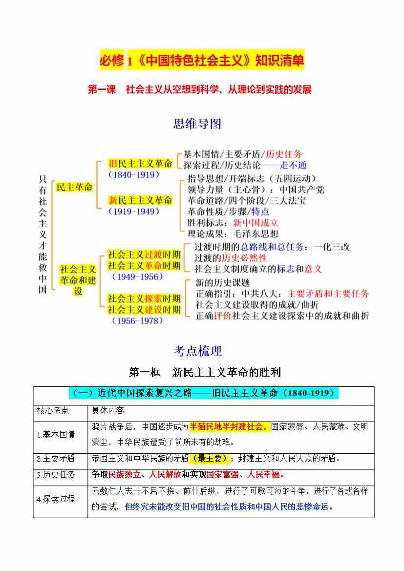 必修一中国特色社会主义(知识清单)-(统编版必修1)
