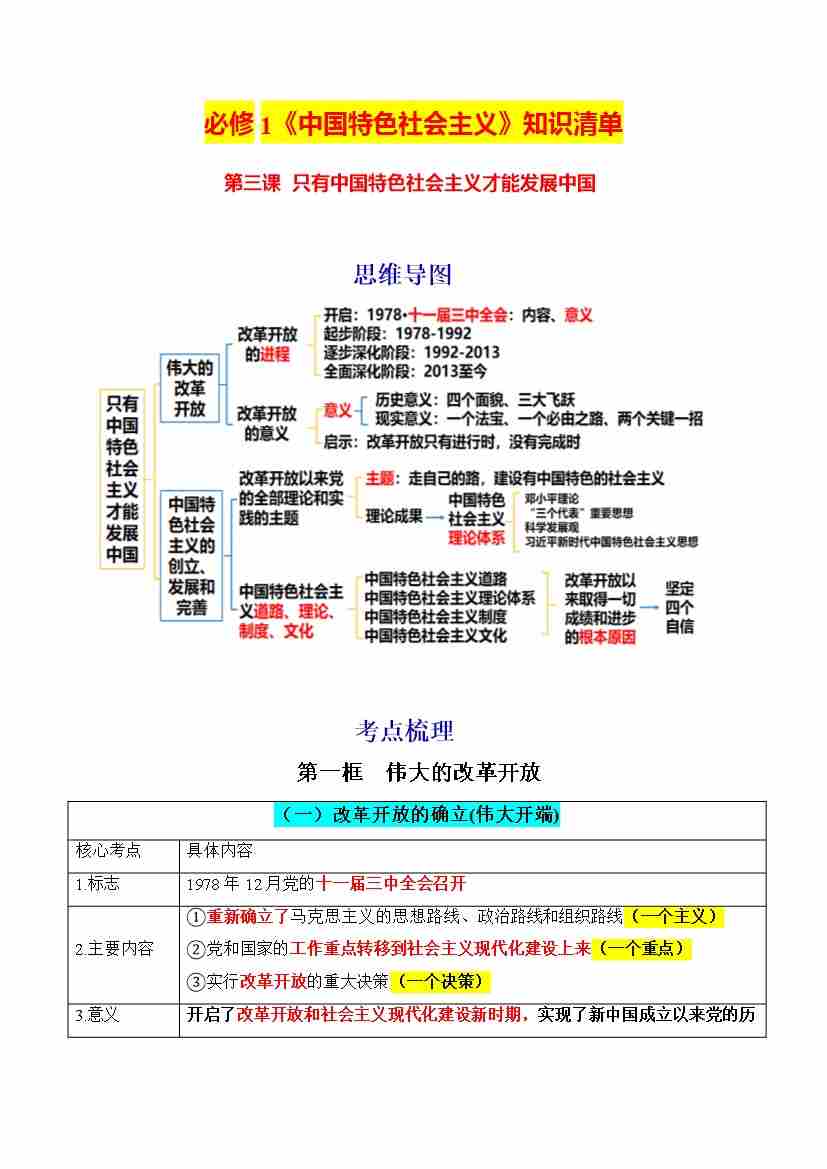 第三课 只有中国特色社会主义才能发展中国(知识清单)(统编版必修1)