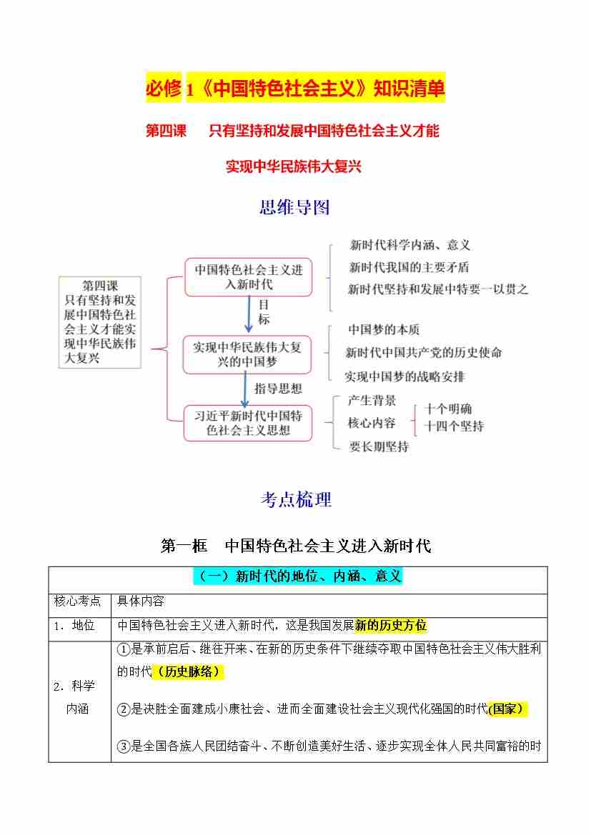 第四课 只有坚持和发展中国特色社会主义才能实现中华民族伟大复兴 (知识清单)-(统编版必修1)