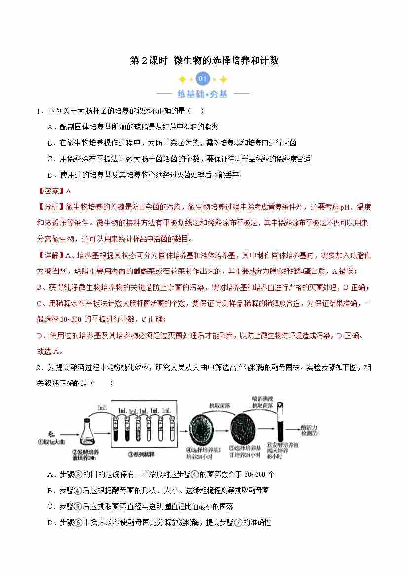1.2.2 微生物的选择培养与计数(解析版)