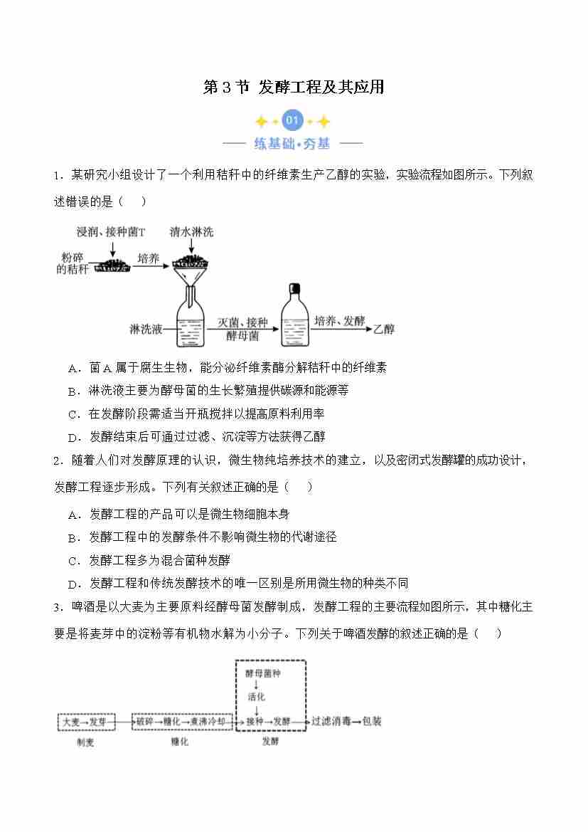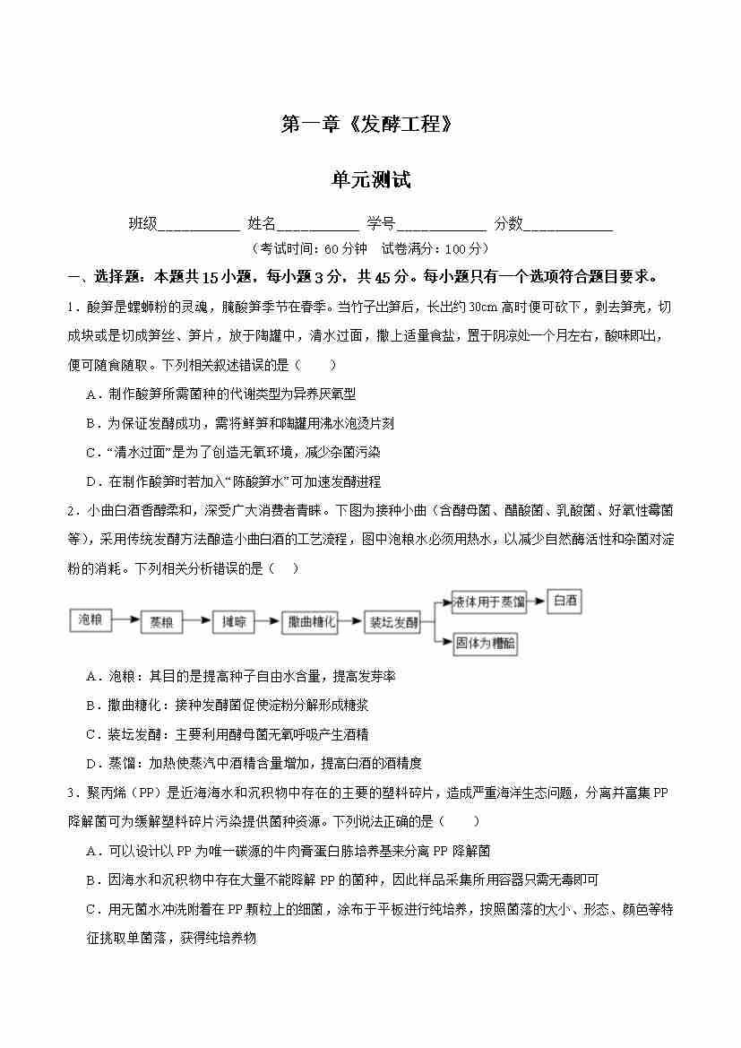 第1章 发酵工程(单元测试) (原卷版)