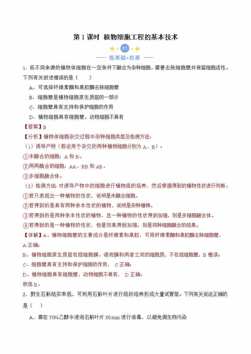 2.1.1 植物细胞工程的基本技术(解析版)