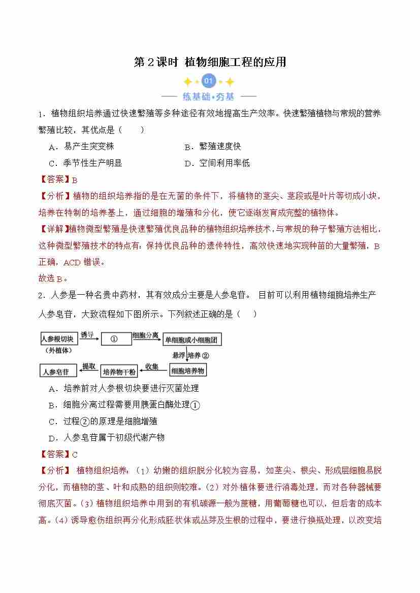 2.1.2 植物细胞工程的应用(解析版)