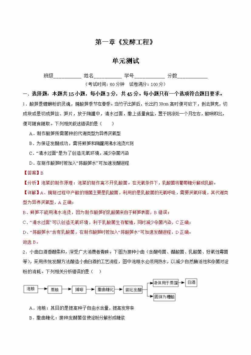 第1章 发酵工程(单元测试) (解析版)