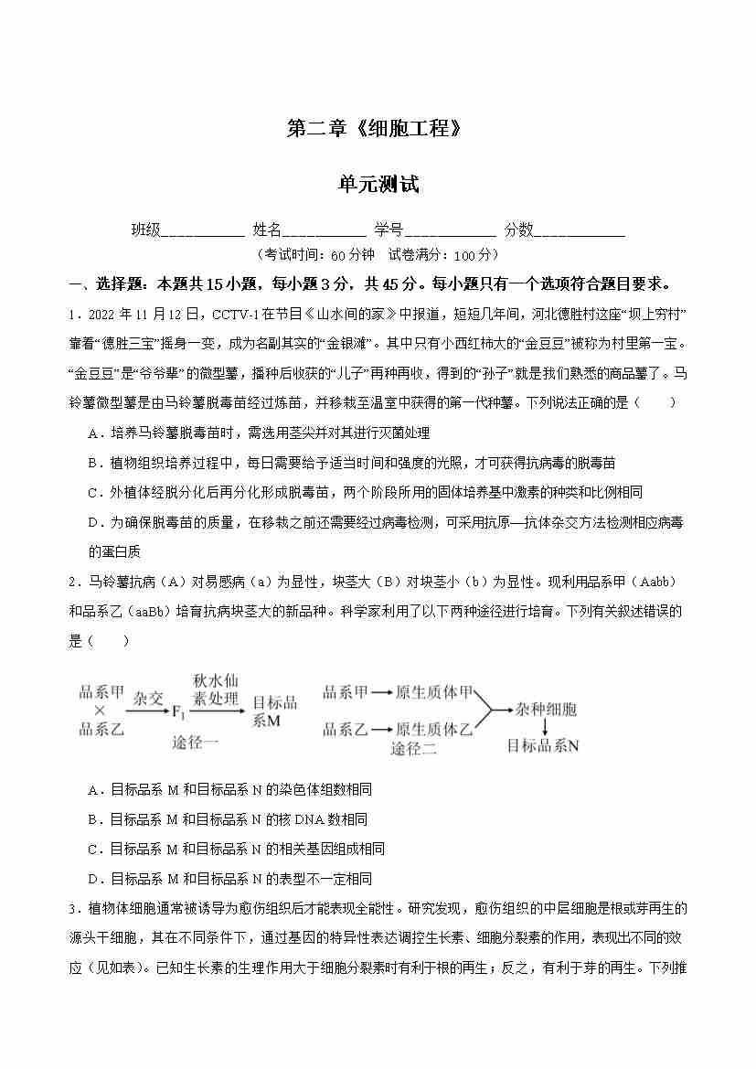 第2章 细胞工程(单元测试) (原卷版)