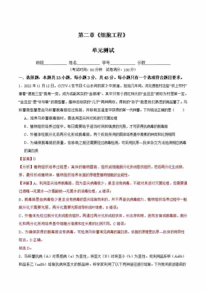 第2章 细胞工程(单元测试) (解析版)