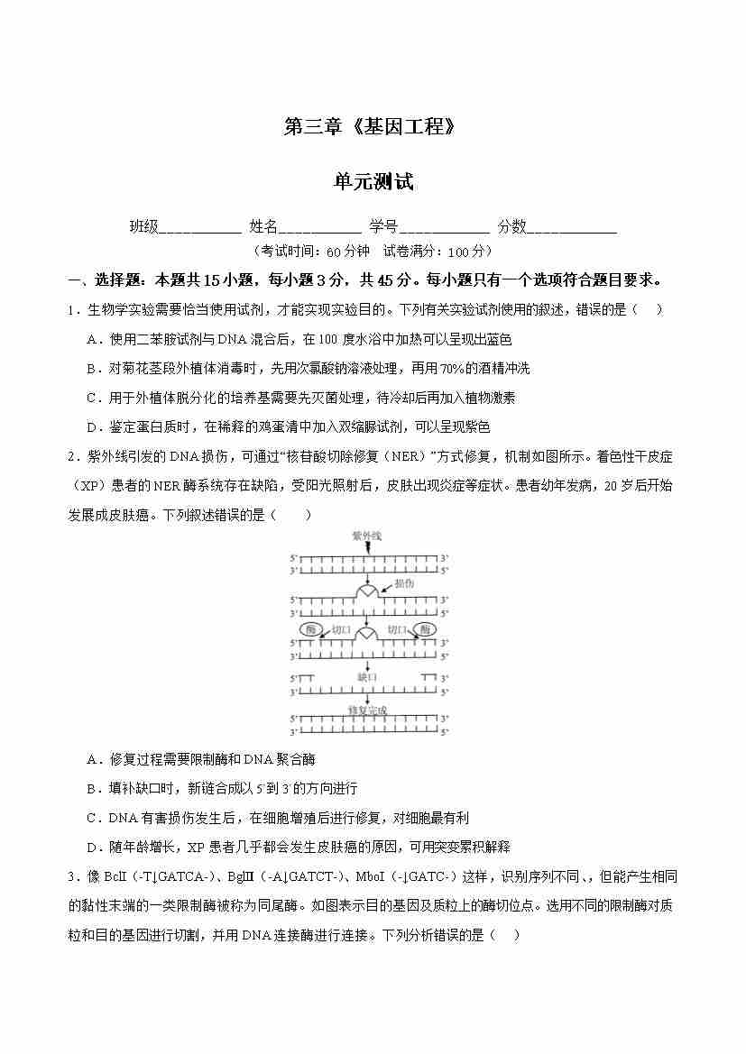 第3章 基因工程(单元测试) (原卷版)