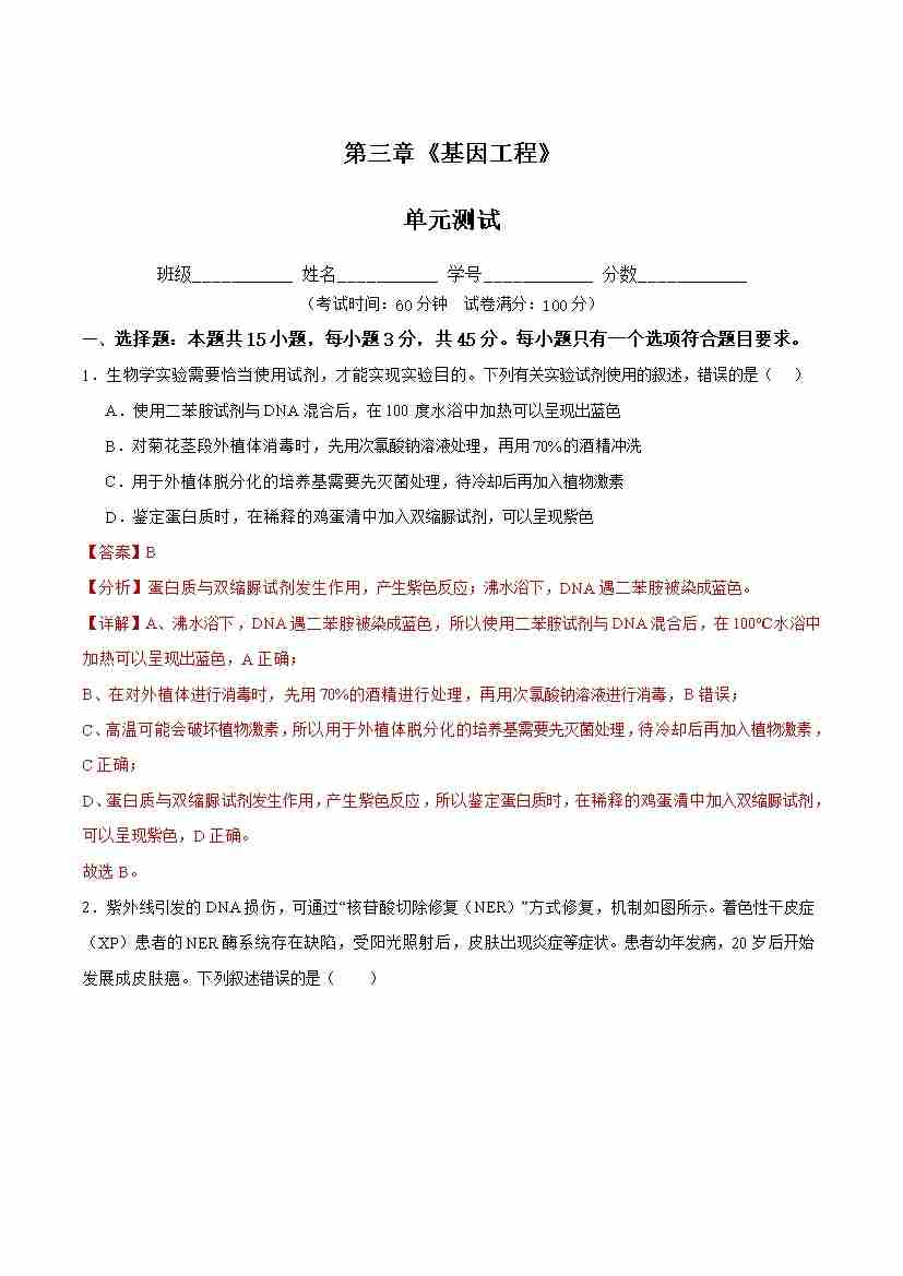 第3章 基因工程(单元测试) (解析版)
