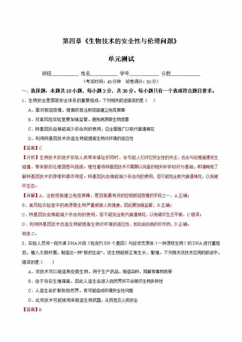 第4章 生物技术的安全性与伦理问题(单元测试) (解析版)