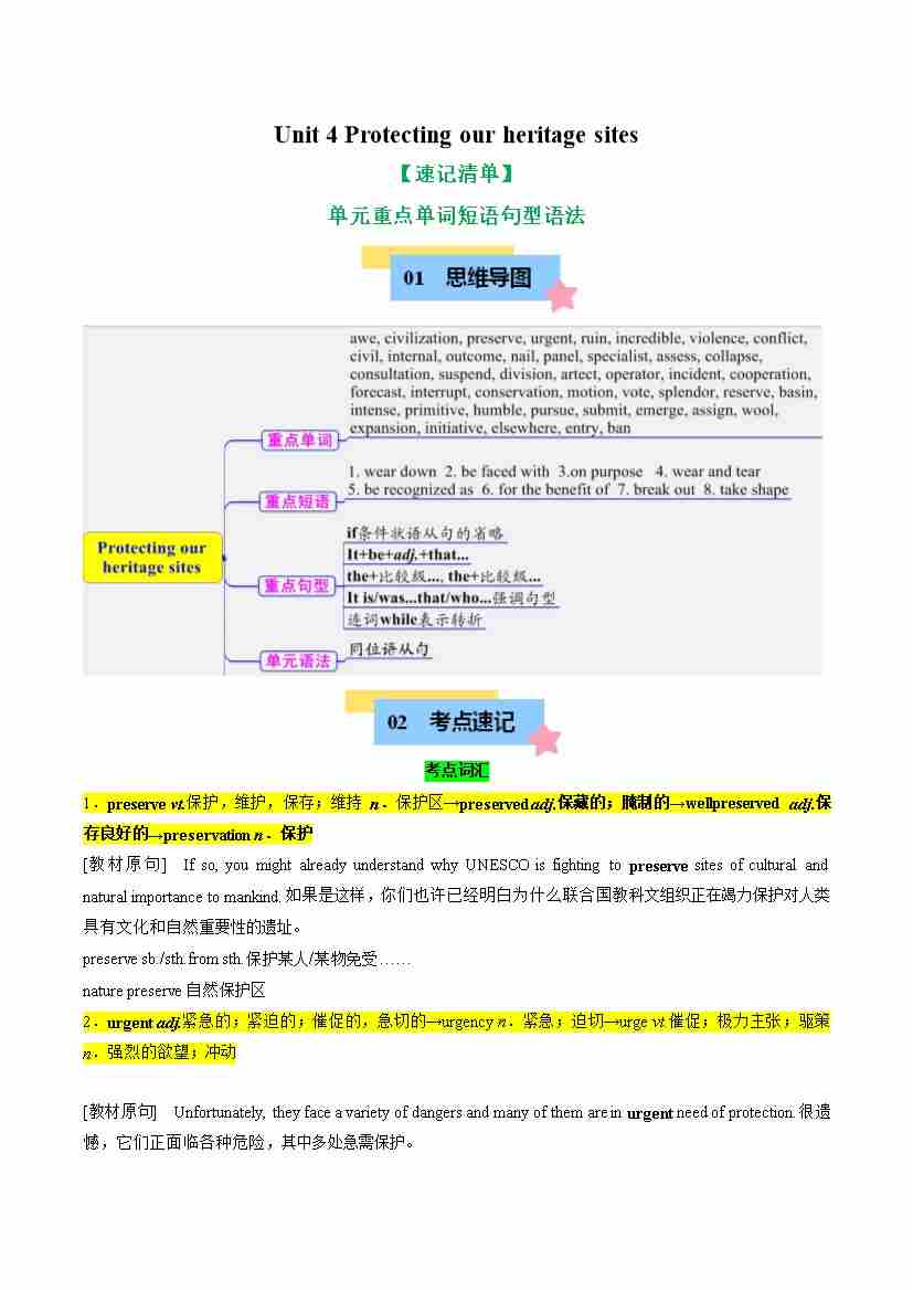 Unit 4 Protecting our heritage sites(知识清单)(学生版)