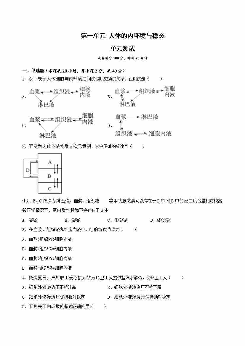 第一章 人体的内环境与稳态(单元测试)(原卷版)