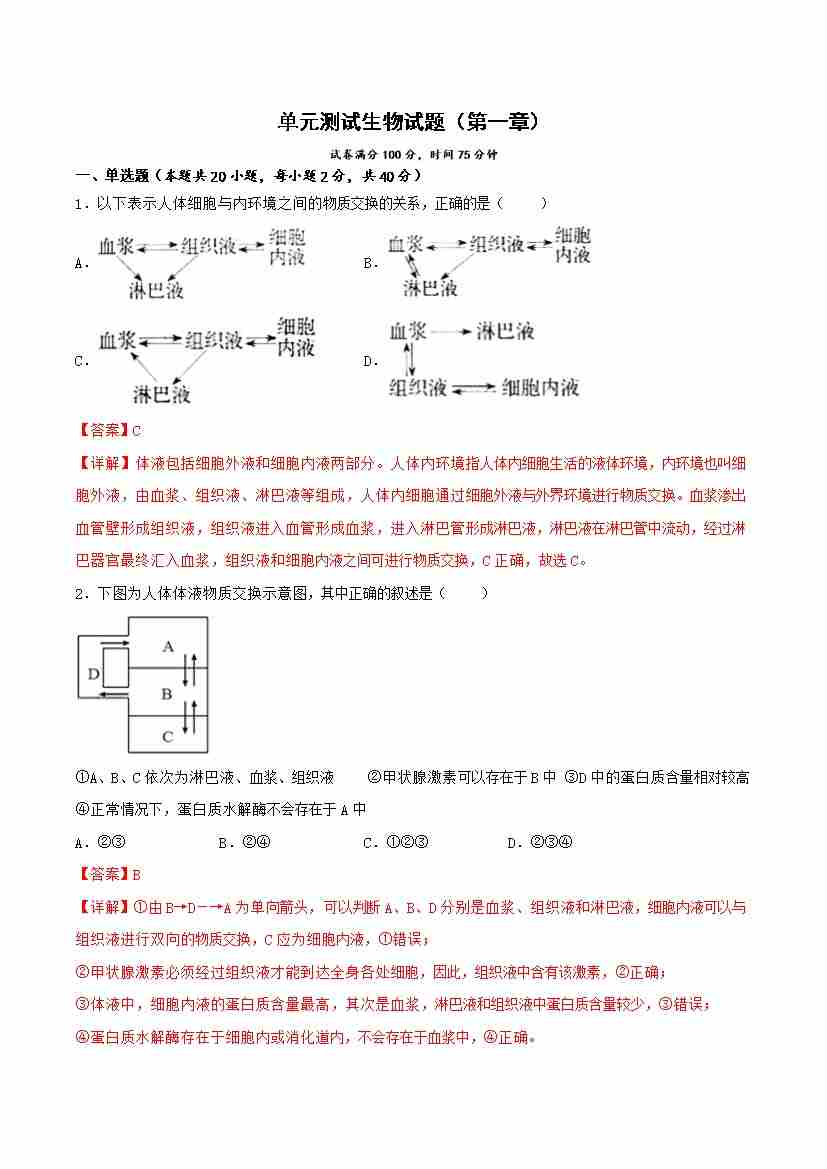 第一章 人体的内环境与稳态(单元测试)(解析版)