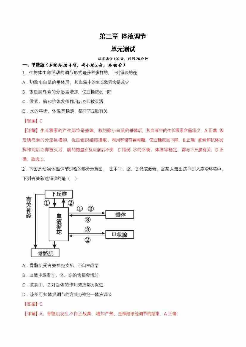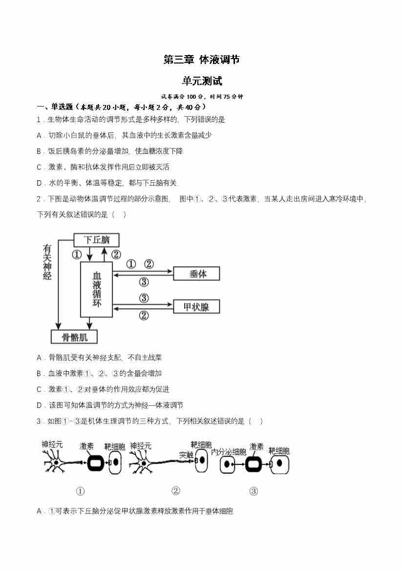 第3章 体液调节(单元测试·提升卷)(学生版)