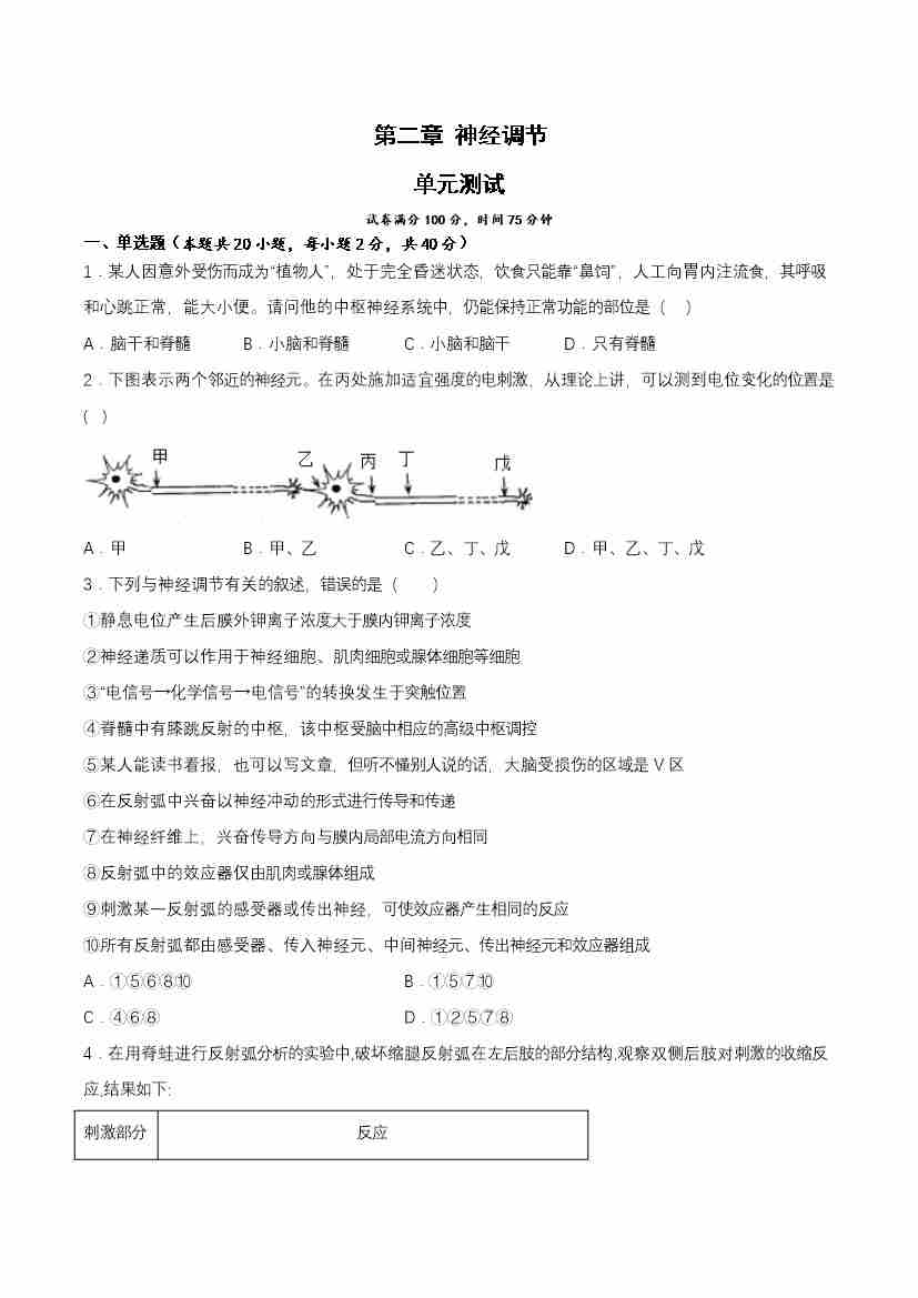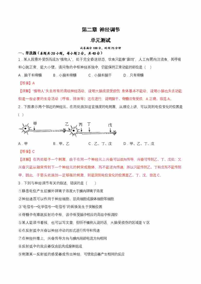 第2章 神经调节(单元测试·提升卷)(学生版)