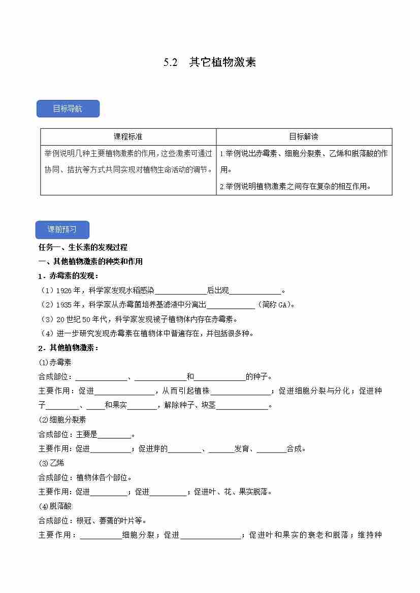 5.2 其它植物激素(人教版选择性必修1)学生版