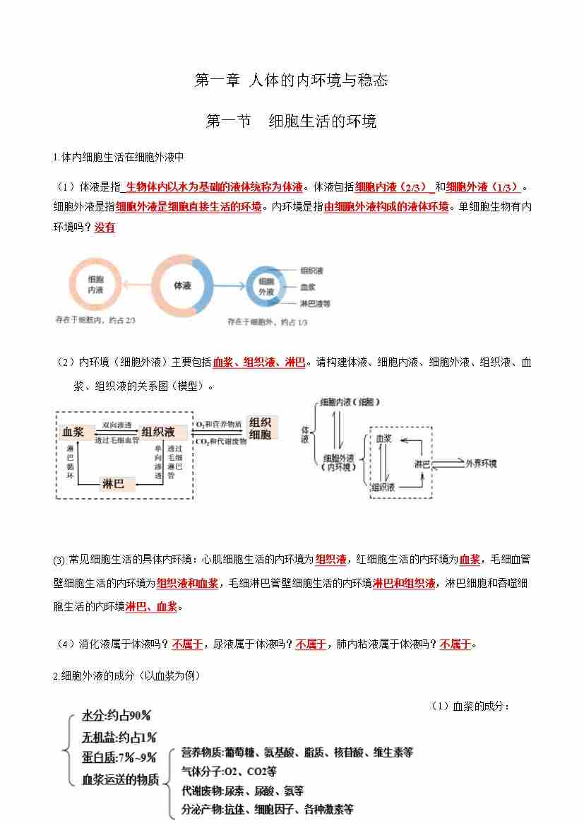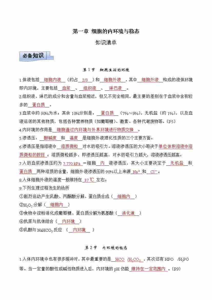 第1章 人体的内环境与稳态(知识清单)(教师版)