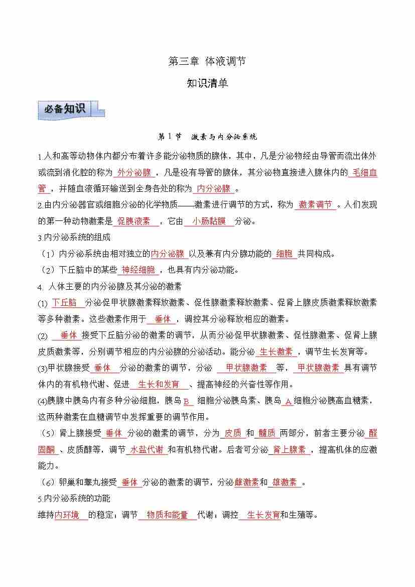 第3章 体液调节(知识清单)(教师版)