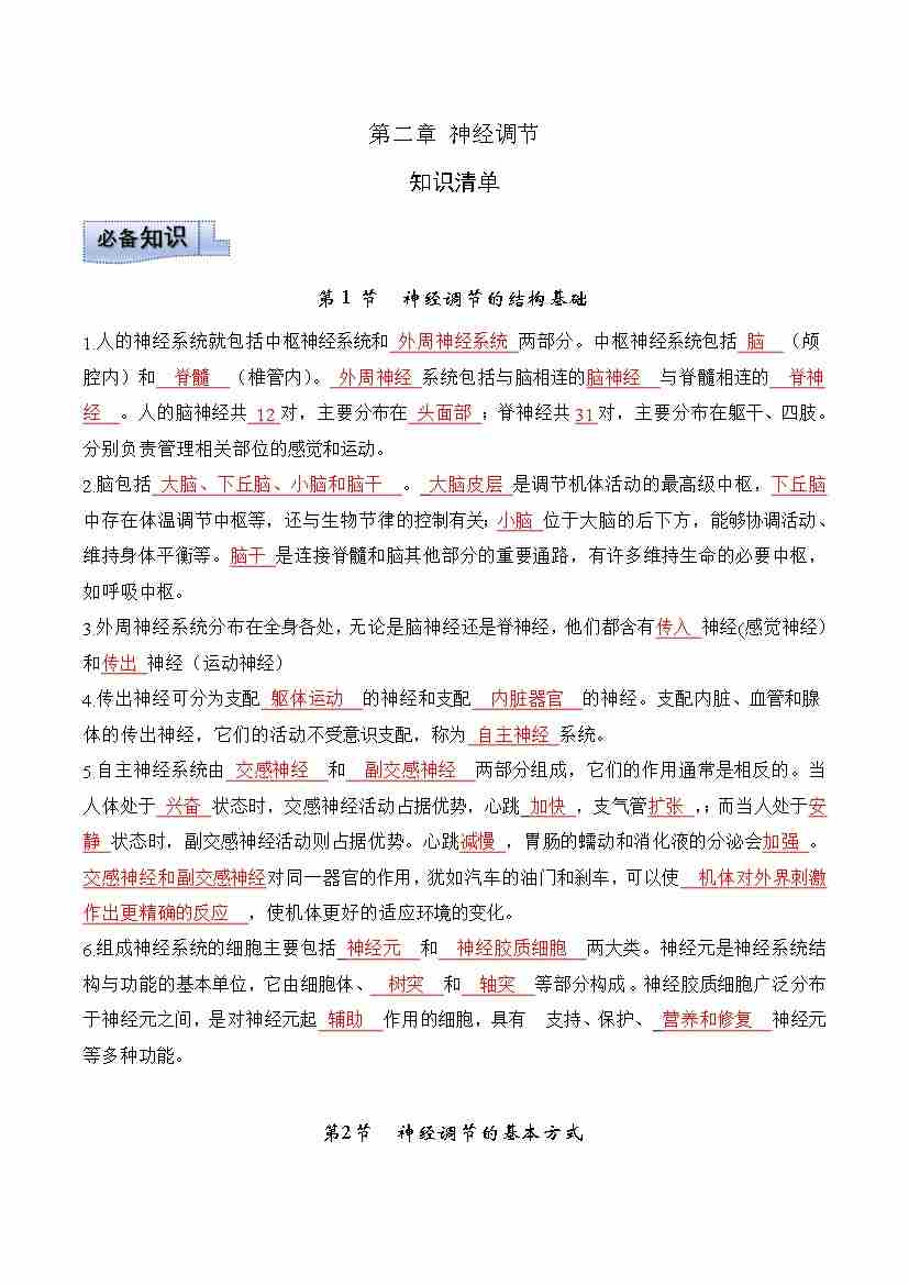第2章 神经调节(知识清单)(教师版)