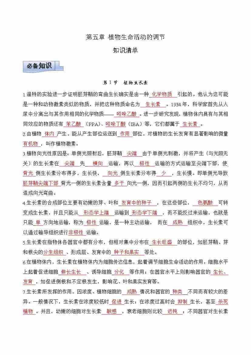 第5章 植物生命活动的调节(知识清单)(教师版)