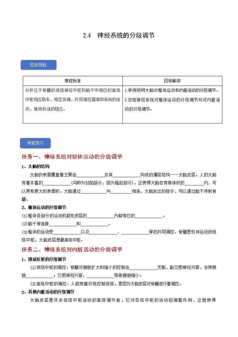 2.4 神经系统的分级调节(人教版选择性必修1)学生版