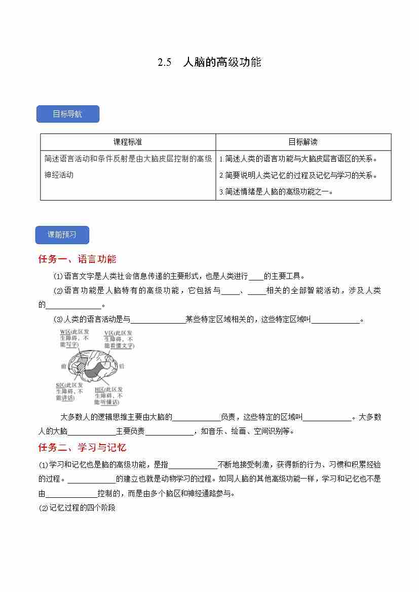 2.5 人脑的高级功能(人教版选择性必修1)学生版