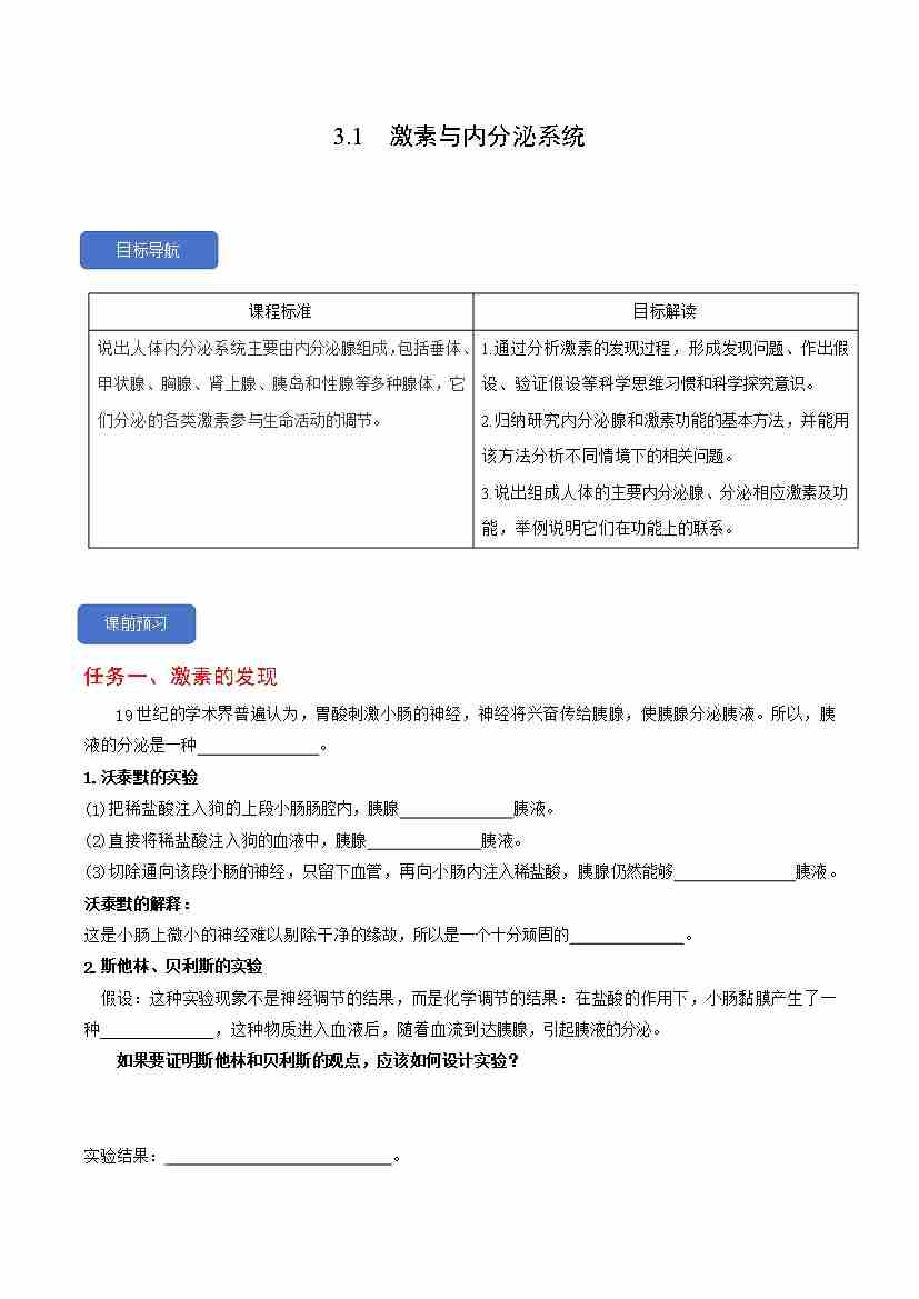 3.1 激素与内分泌系统(人教版选择性必修1)学生版