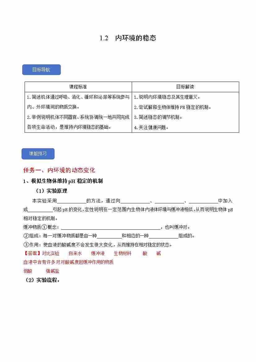 1.2 内环境的稳态(人教版选择性必修1)教师版