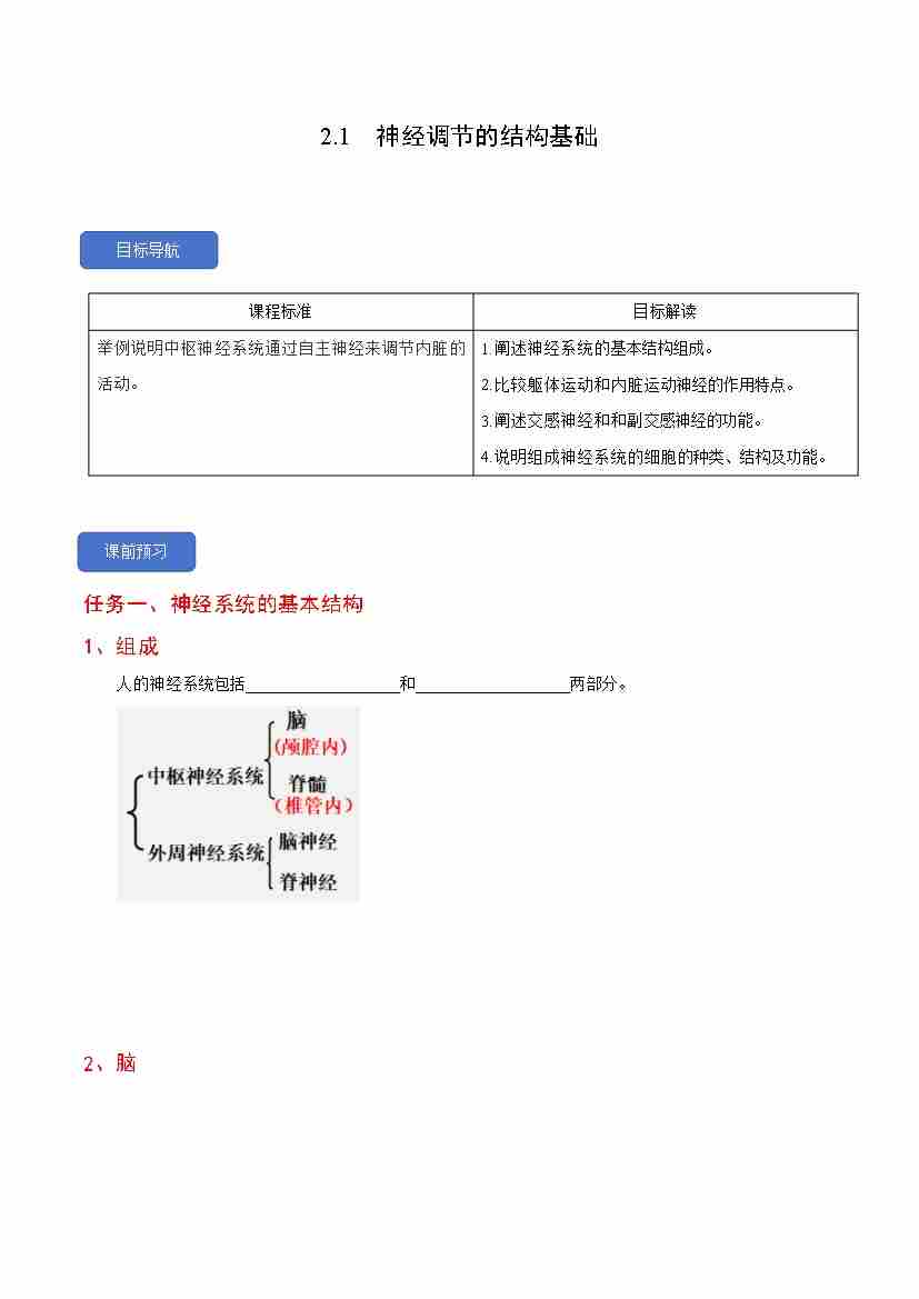 2.1 神经调节的结构基础(人教版选择性必修1)学生版