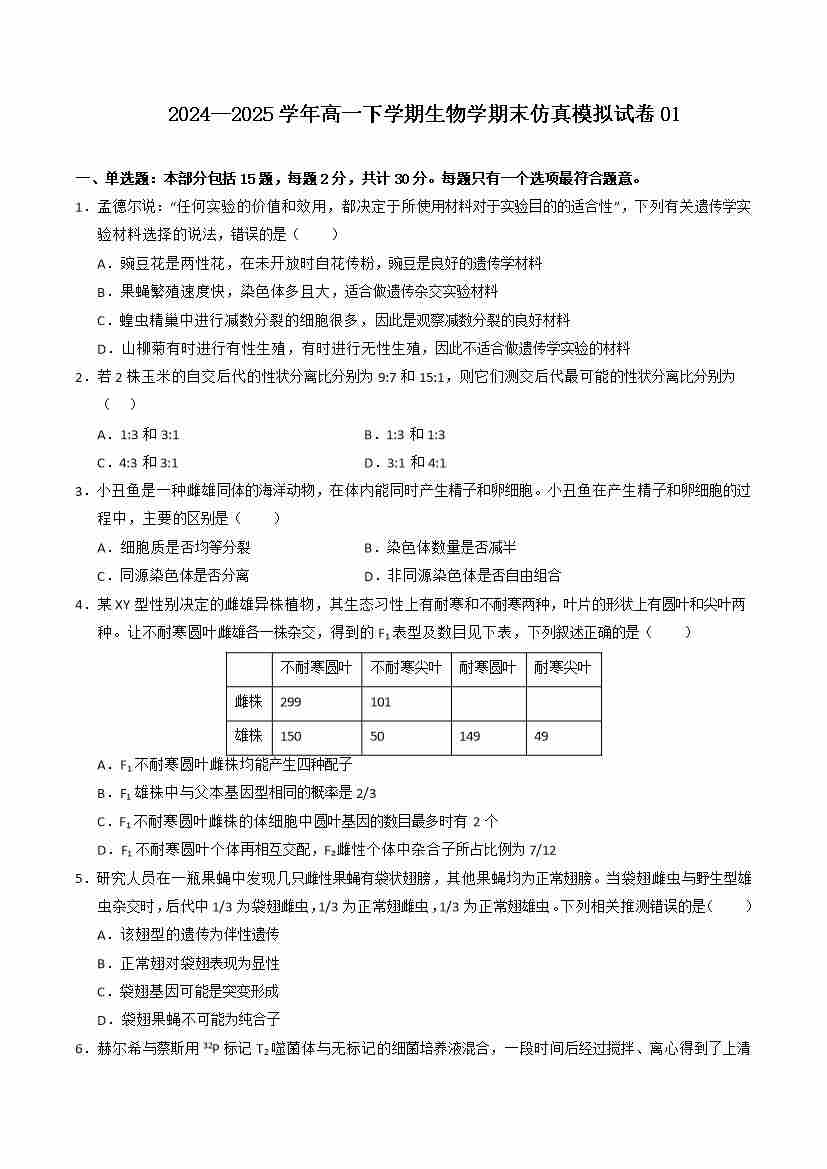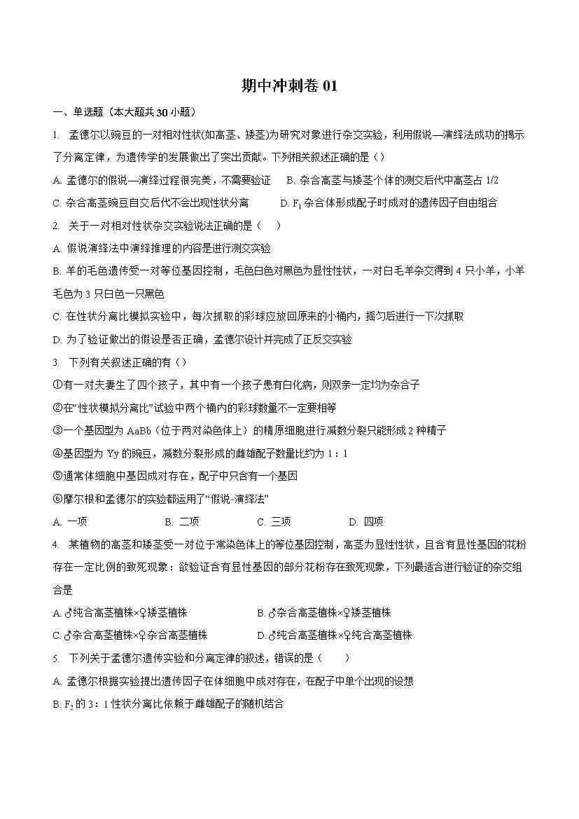 期中冲刺卷01-高一生物下学期期中期(人教版2019必修2)(学生版)