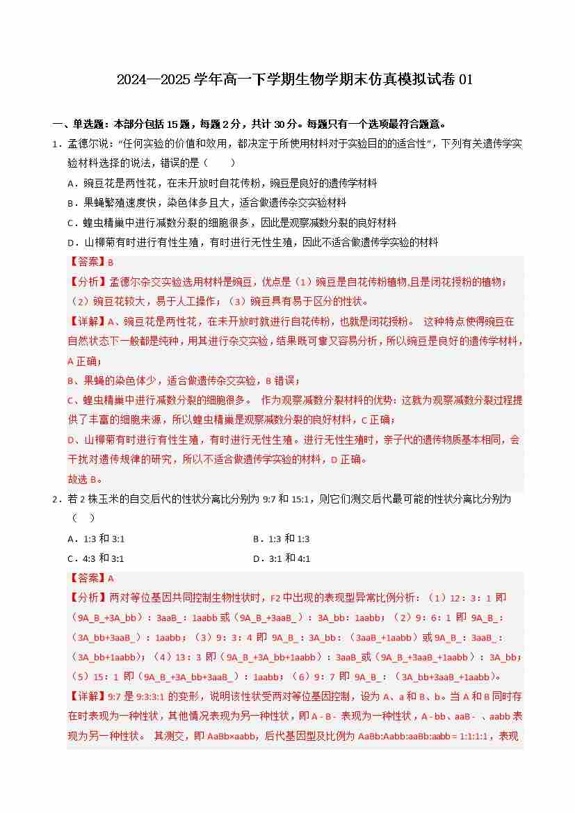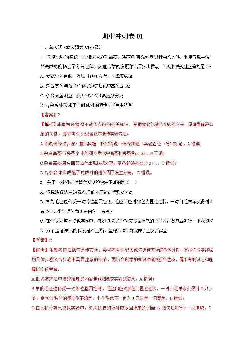 期中冲刺卷01-高一生物下学期期中期(人教版2019必修2)(教师版)