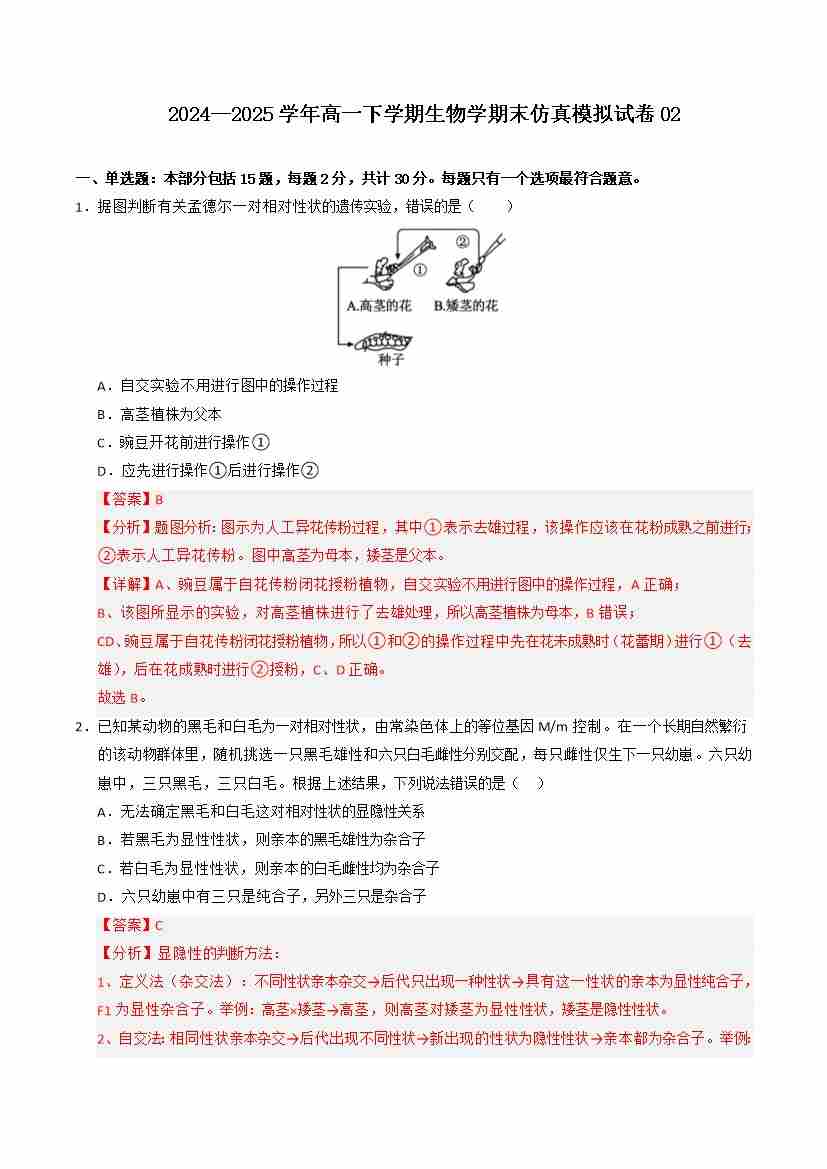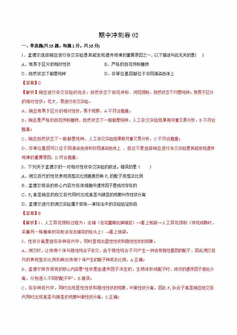 期中冲刺卷02-高一生物下学期期中期(人教版2019必修2)(教师版)