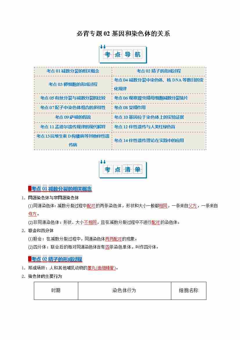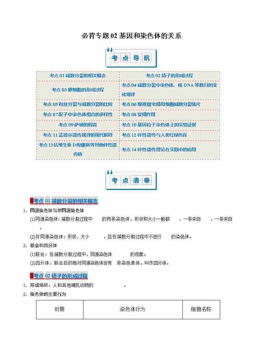 (考点清单)专题02 基因和染色体的关系(14大考点)(学生版)