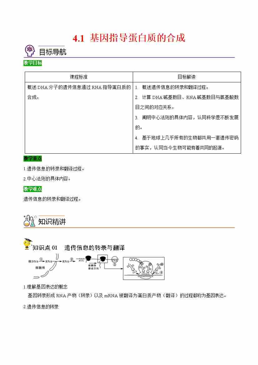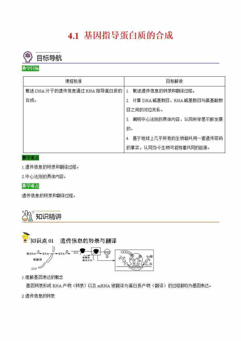 4.1 基因指导蛋白质的合成(学生版)(人教版必修2)