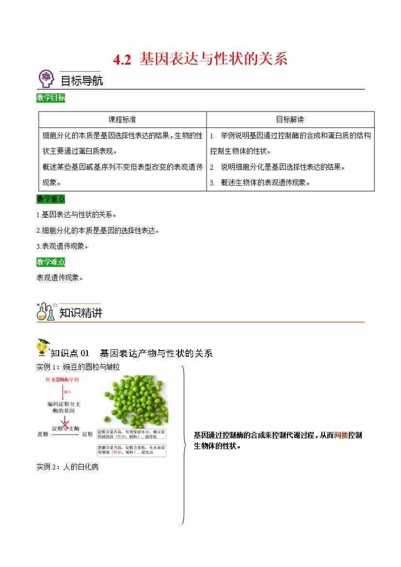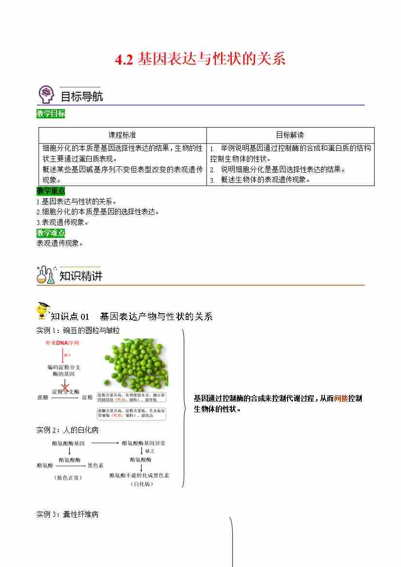 4.2 基因表达与性状的关系(学生版)(人教版必修2)
