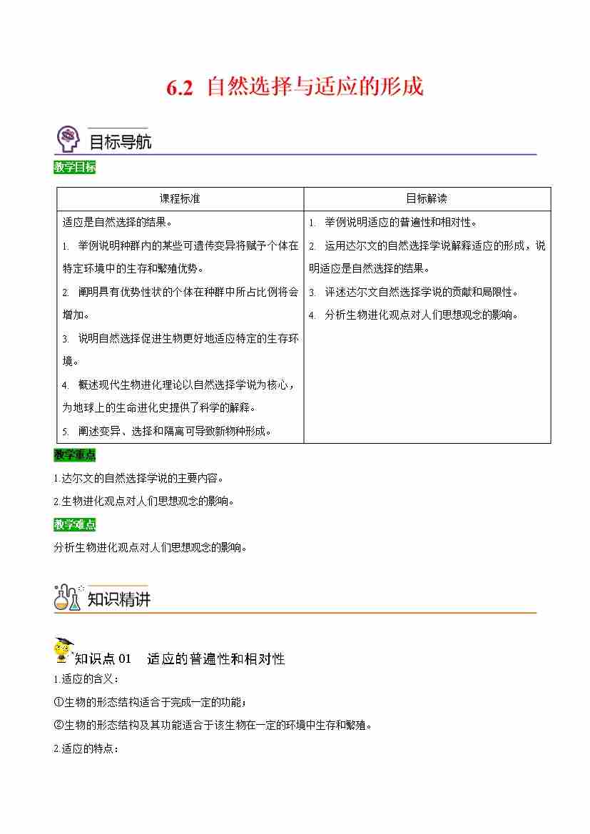 6.2 自然选择与适应的形成(学生版(人教版必修2)