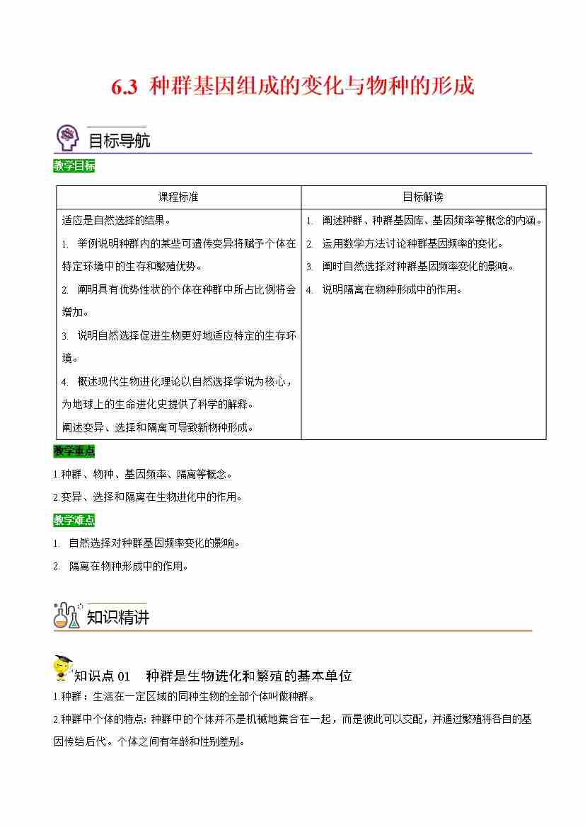 6.3 种群基因组成的变化与物种的形成(学生版)(人教版必修2)