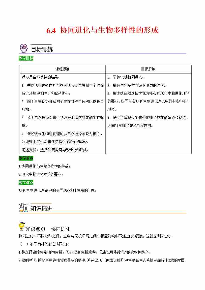 6.4 协同进化与生物多样性的形成(学生版)(人教版必修2)