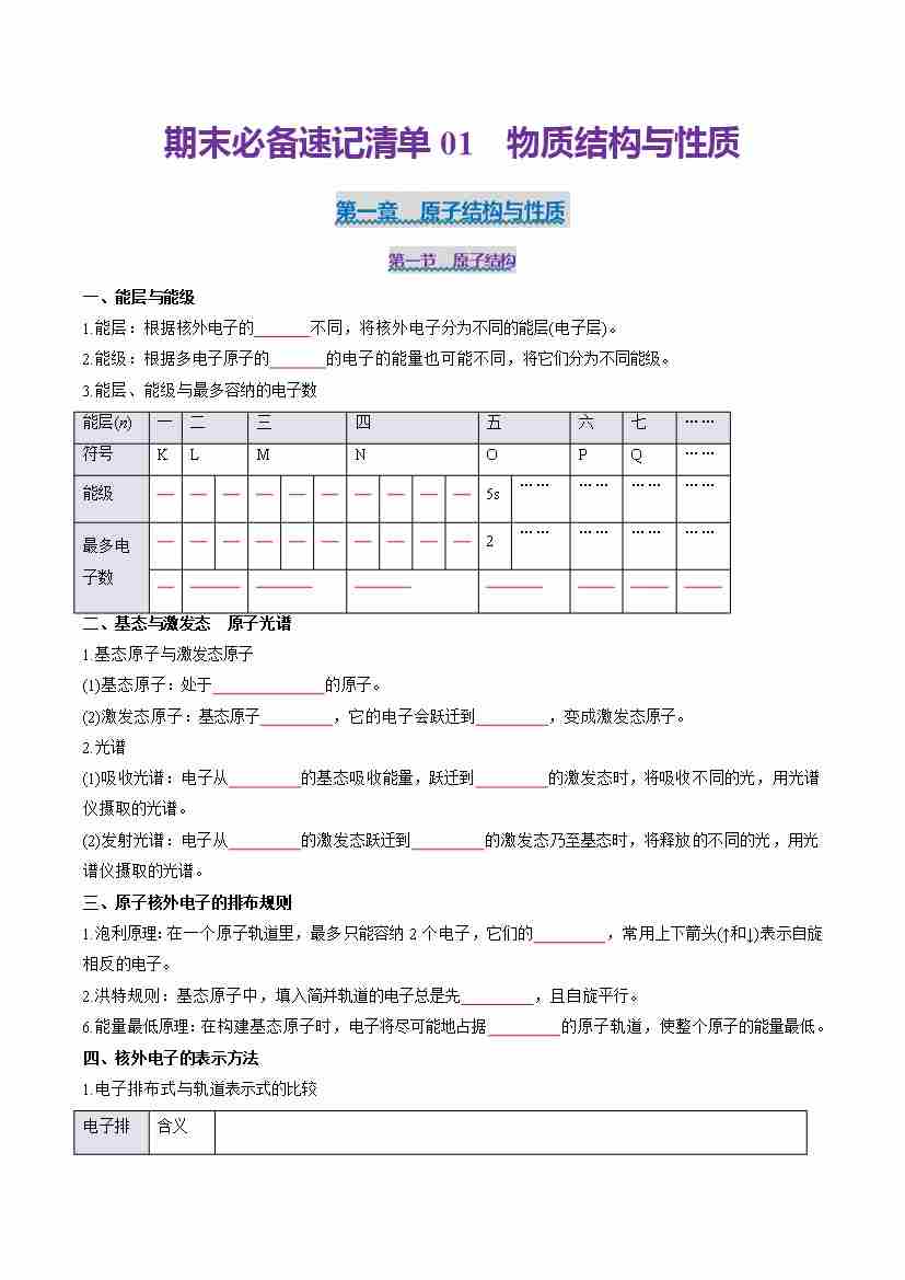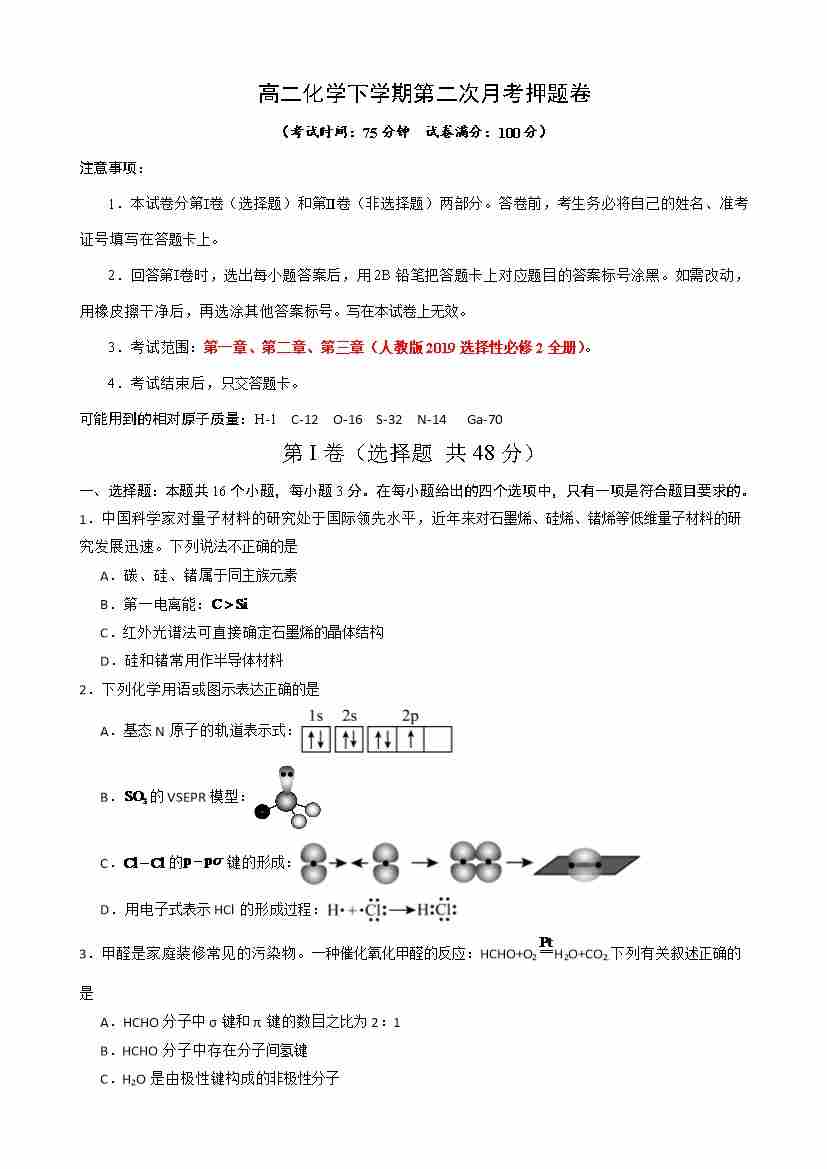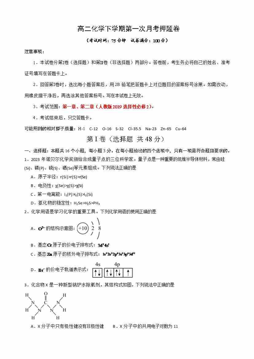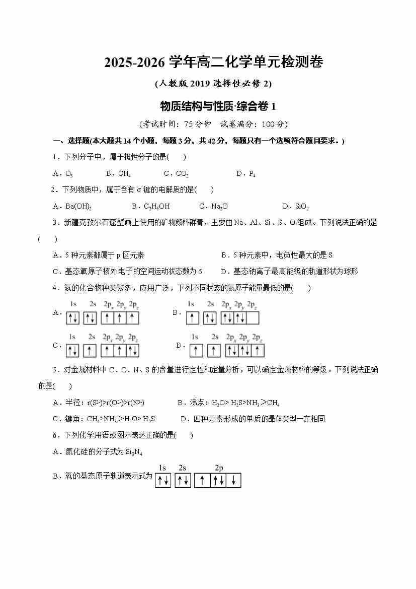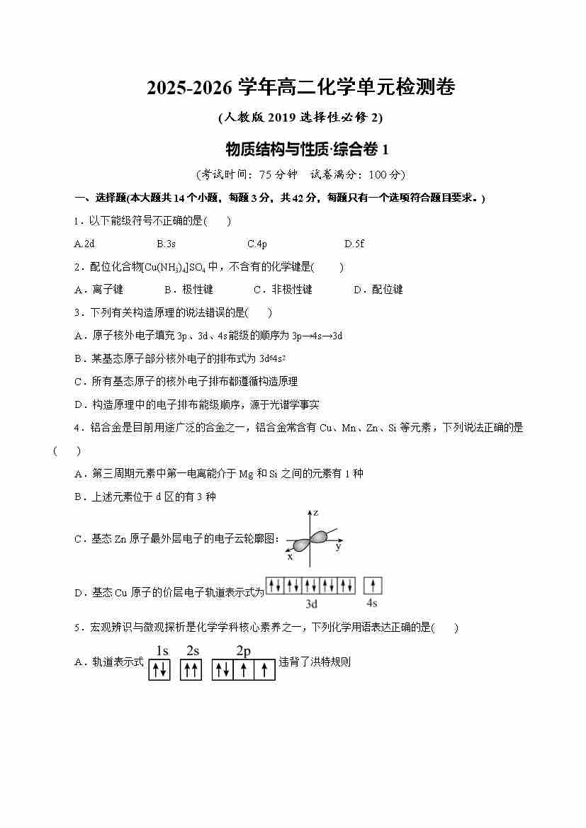 《物质结构与性质》(综合卷1)(人教版2019选择性必修2)(考试版A4)