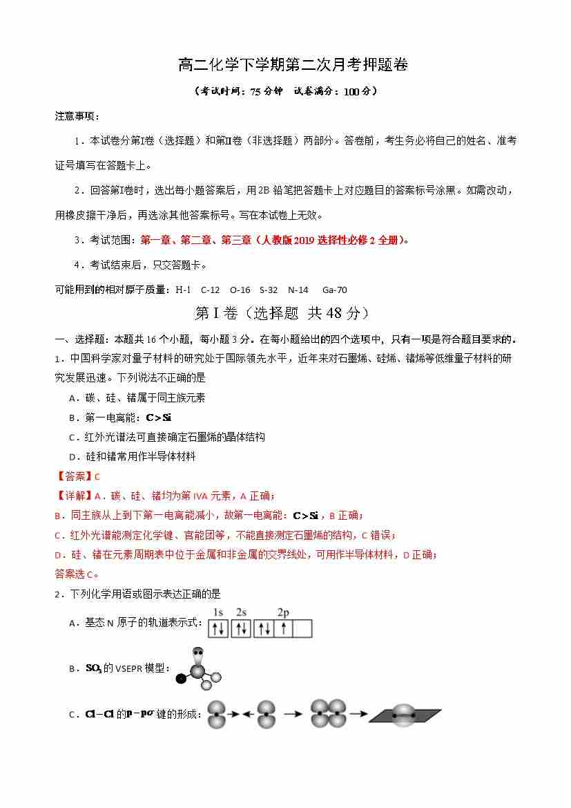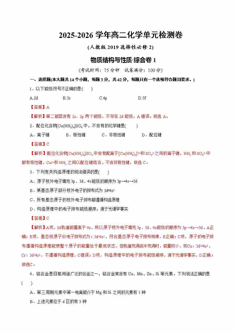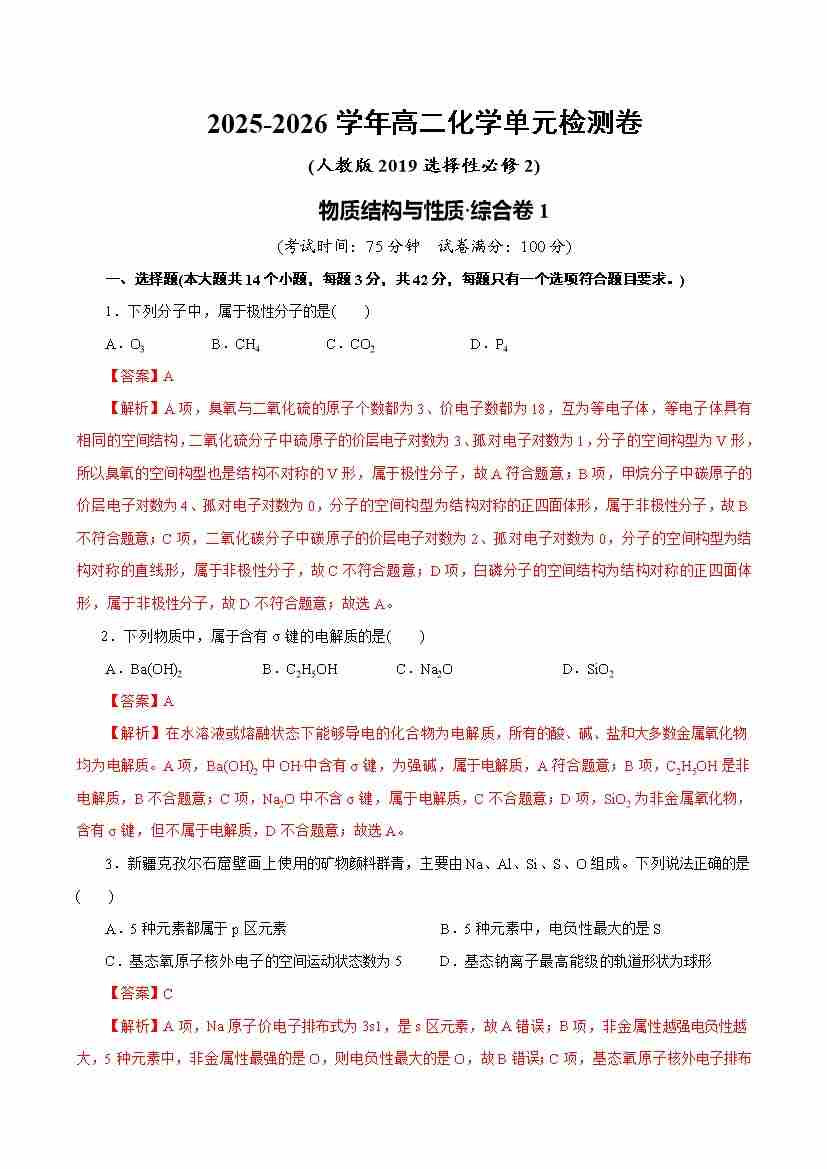 《物质结构与性质》(综合卷1)(人教版2019选择性必修2)(解析版)