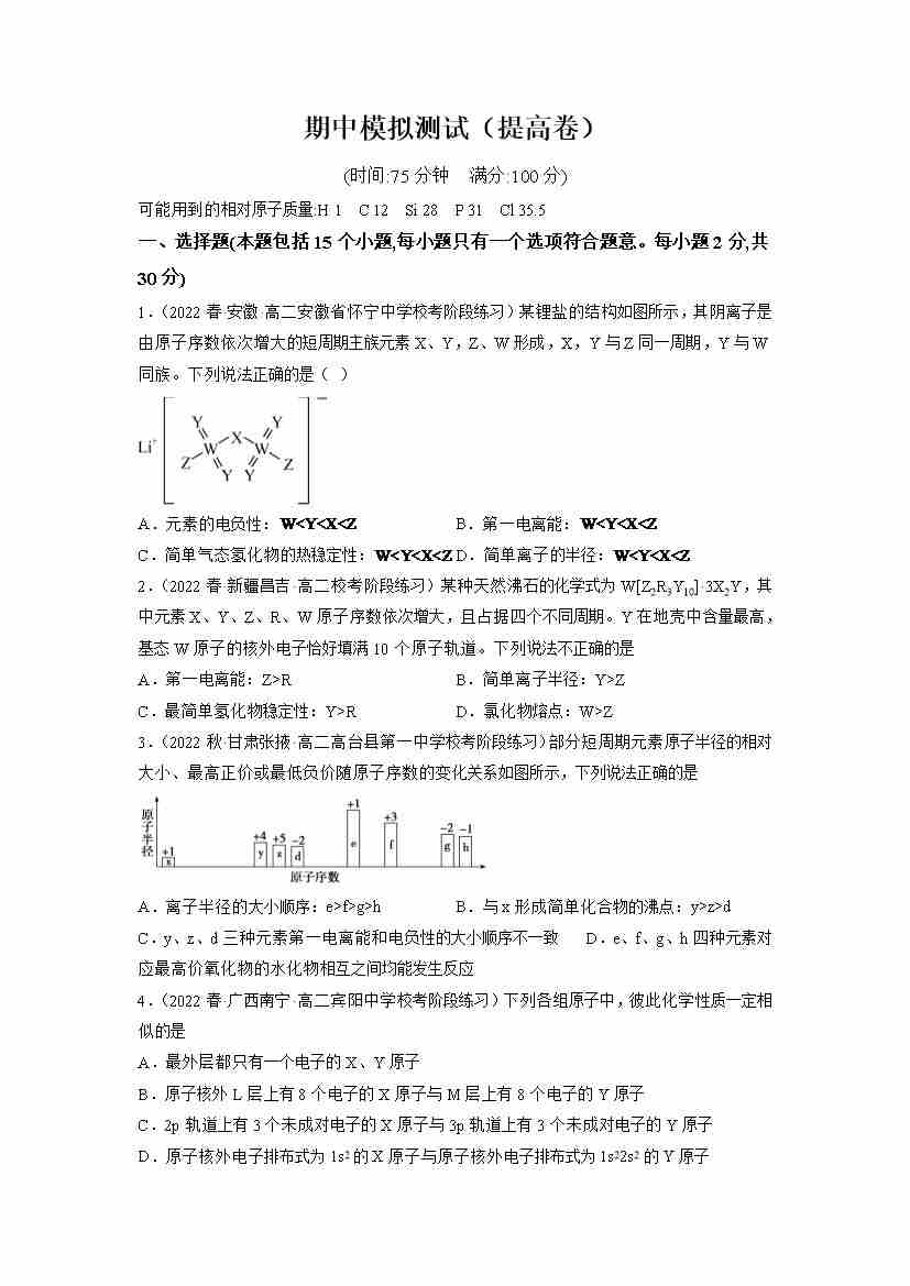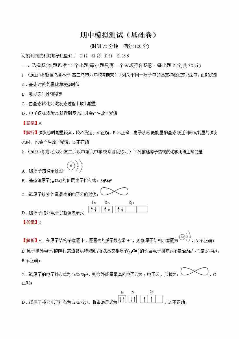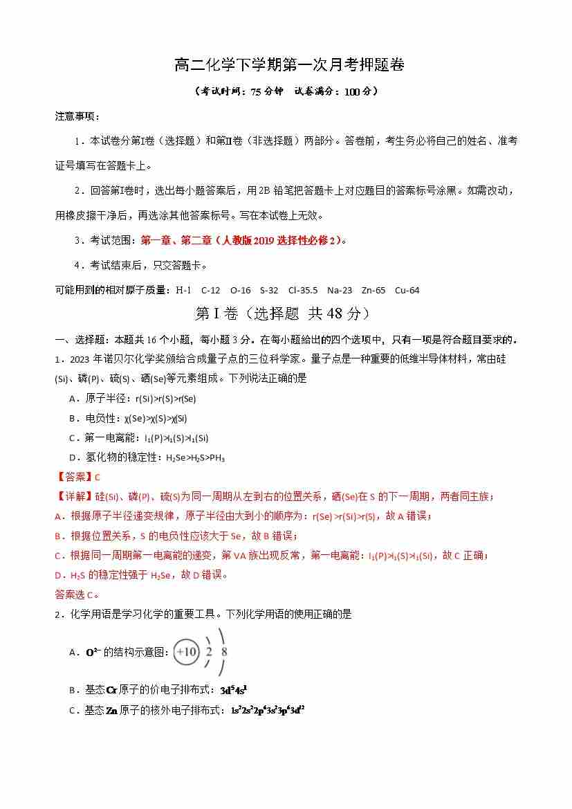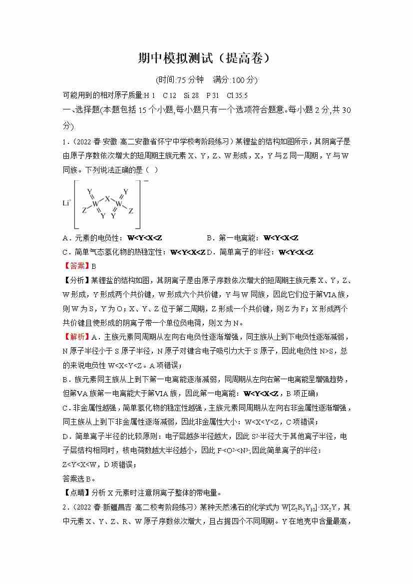 《物质结构与性质》(综合卷1)(人教版2019选择性必修2)(解析版)