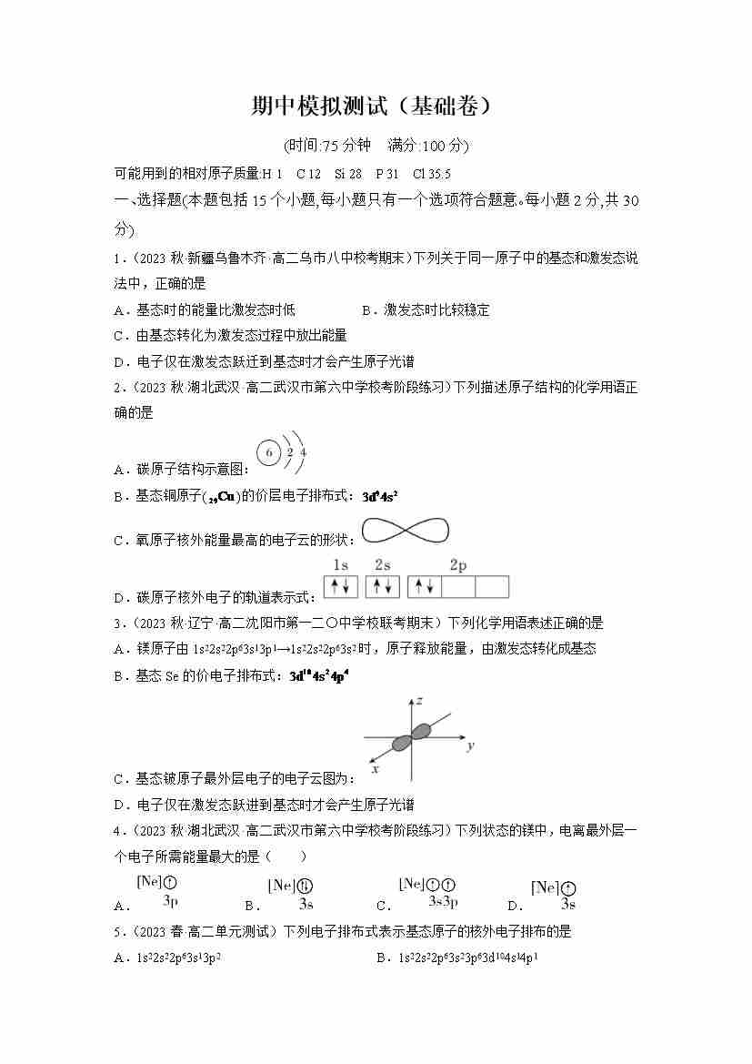 第一次月考押题卷(范围:第一章、第二章)(人教版选择性必修2)(学生版)