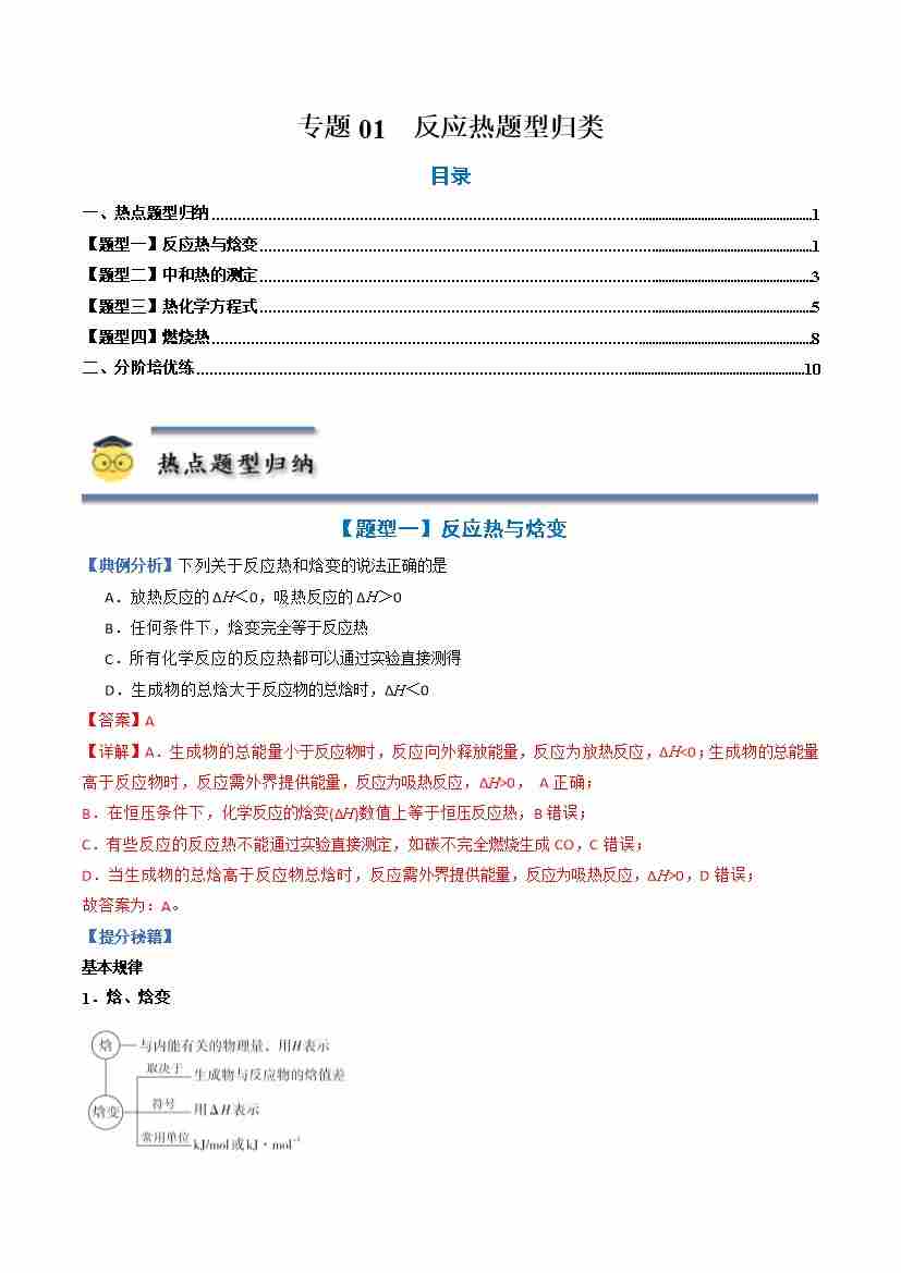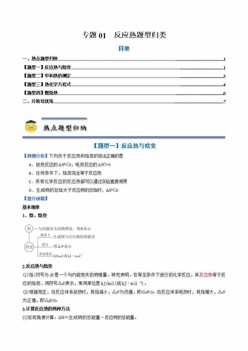 专题01反应热-(人教版2019选择性必修1)(学生版)