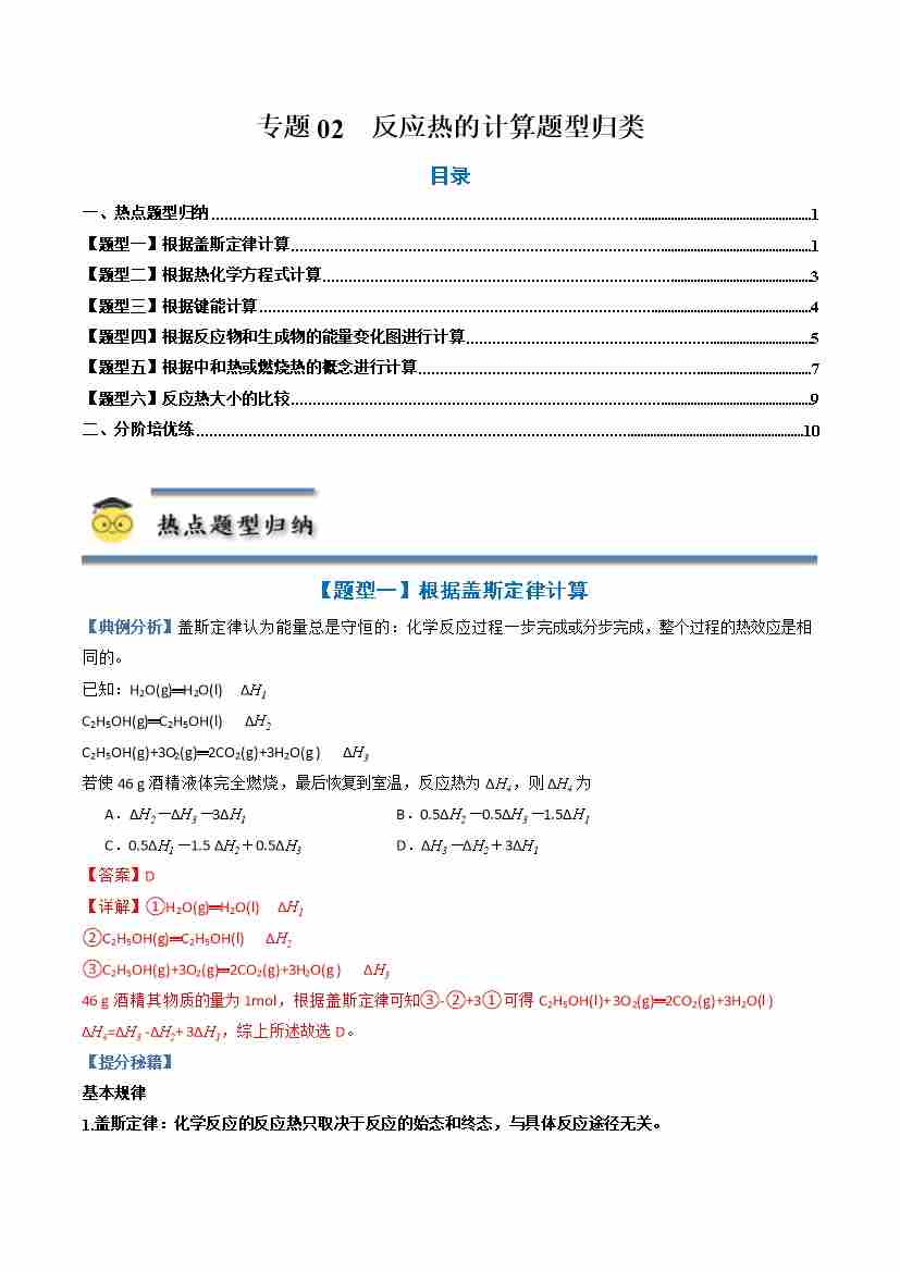 专题02反应热的计算-(人教版2019选择性必修1)(教师版)